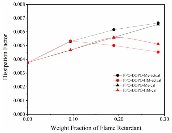 In addition, the theoretical Df values of PPO/FR were calculated based on the weight addition and crystallinity of each component. The Df values of amorphous DOPO-Me and DOPO-HM obtained in PMMA/FR were used for amorphous flame retardants. Figure 7 shows the comparison of theoretical curves vs. experimental curves. It can be seen that a generally fair-to-good agreement with measurements is obtained, especially at high loadings of flame retardants.
