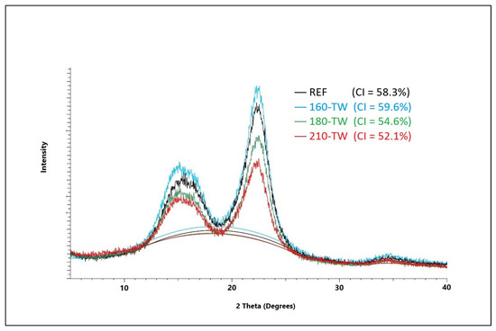 At 160 °C, the degree of polymerization (DP) of cellulose increases slightly (Table 5, Figure 3 and Figure 4), which may be due to the aggregation of cellulose chains, a phenomenon also observed during kraft pulping and hydrothermal treatment [63,64]. Higher temperatures cause the disintegration of the aggregates and significant depolymerization of the cellulose chains, resulting from the cleavage of glycosidic bonds. Cellulose DP at 210 °C was reduced by half, while no significant difference was observed between the samples before and after accelerated aging (Table 5). Similar results were reported for mild torrefaction of eucalyptus wood, where DP values decreased from 1300 to 530 and from 1330 to 590, respectively [58].