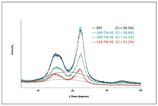 The crystallinity index (CI) of the samples was determined by the X-ray diffraction (XRD) technique using a Bruker D2 Phaser X-ray powder diffractometer (Bruker AXS, GmbH, Karlsruhe, Germany). The diffraction patterns were recorded using CuKα radiation (λ = 0.154060 nm), a voltage of 30 kV, and a current of 10 mA. The equipment was operated in continuous scan mode with a step size of 0.025° (2Θ), a step time of 5 s, and a scan range 5° < 2Θ < 40°. The CI was calculated by the amorphous subtraction method using the Bruker DIFFRAC.EVA version 5.2 software [48].