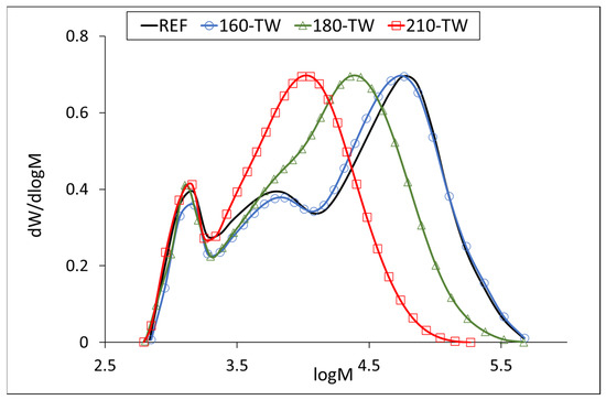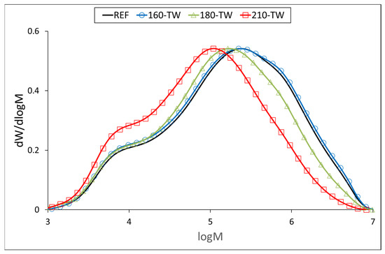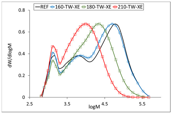 Our results for the average molecular weight of the hemicelluloses isolated from the untreated sample (about 45,000 g·mol−1) agree with the published ones. The temperature of 160 °C degrades the hemicellulose chains only slightly, while accelerated aging has a more significant effect at this temperature. A similar phenomenon can be observed at 180 °C, where the decrease in molecular weight is more pronounced, 40% after thermal treatment and 45% after accelerated aging. At 210 °C, the decrease was similar for both samples, around 70% (Table 6). The molecular weight distribution curves of hemicelluloses from the untreated sample show three fractions with molecular weights of approximately 57,000 g·mol−1 (REF, 160-TW), 6000 g·mol−1 (REF, 160-TW), and 1300 g·mol−1 (all samples). The maximum of the fractions with the highest values decreases in the heat-treated samples from approximately 57,000 g·mol−1 (REF, 160-TW) to 22,700 g·mol−1 (180-TW) and to 11,300 g·mol−1 (210-TW). In aged samples, the decrease in molecular weight of these fractions is somewhat faster, from approximately 57,000 g·mol−1 (REF) to 49,800 g·mol−1 (160-TW-XE), 22,600 g·mol−1 (180-TW-XE), and 9800 g·mol−1 (210-TW-XE). The peak with the middle fractions shows a shoulder in the 180-TW sample, while in the 210-TW sample, it is overlapped by the peak with the highest molecular weight. The peak with the lowest molecular weight has the same value in both types of samples (around 1300 g·mol−1) (Figure 5 and Figure 6).