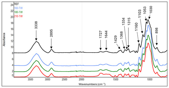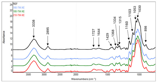 The cellulose content increases at 210 °C, possibly due to aggregation with lignin and degradation products of hemicelluloses [54]. This phenomenon is supported by the results of carbohydrate analysis, where the amount of glucose decreases with increasing thermal treatment temperature (Table 3). In addition, typical bands for aromatic compounds (1604, 1512, 1261 cm−1) appear in the FTIR spectra of cellulose at 210 °C. Our results are consistent with the changes observed in hygrothermally modified holocellulose—decreased monosaccharides content and the appearance of signals in FTIR spectra indicating the formation of the aromatic compounds [55].