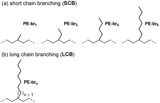 The typical α-olefins used in the synthesis of LLDPE are 1-butene, 1-hexene and 1-octene, which introduce short chain branches (SCB; Figure 1) consisting of two (PE-br2), four (PE-br4) and six (PE-br6) carbon atoms in the otherwise perfectly linear polyethylene backbone, respectively [7]. The amount, distribution and length of these SCB critically influence the macroscopic properties of the final material [8,9,10,11,12]. SCB of only one carbon can also be introduced in PE via copolymerization of ethylene and propene, which however does not provide a thermoplastic material but the so-called ethylene-propylene rubber (EPR; Figure 1) [4,13].