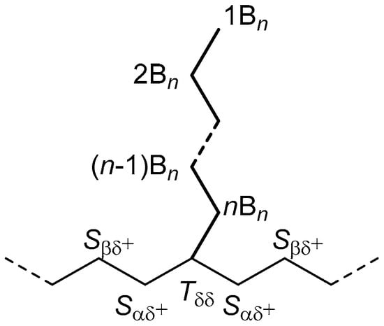 NMR signals were assigned according to the literature [53,54,55], using the nomenclature proposed by Randall [26]. The carbon atoms of the side chains are indicated as Bn, where n is the total number of C atoms of the ramification, preceded by a number indicating the position of each carbon (with the terminal methyl corresponding to position 1; Figure 2). In the polyethylene backbone, the branch carbon is indicated as Tδδ, while the C atoms in α and β position with respect to this methine group are named Sαδ+ and Sβδ+, respectively (Figure 2).