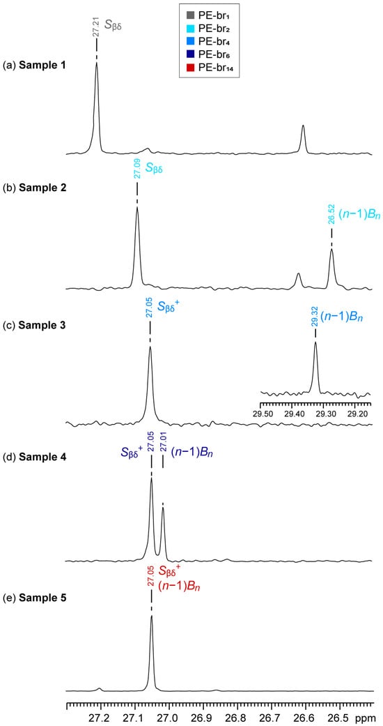 Figure 3 shows the 13C NMR spectra of the five PE samples, expanded in the Cβ region. PE-br1 only has Sβδ+ carbons, which resonate at a characteristic δ(13C) = 27.21 ppm (Figure 3a). As expected, it can be easily distinguished from PE-br2 and PE-br4 owing to their distinctively different Sβδ+ signals resonating at 27.08 vs. 27.05 ppm, respectively (Figure 3b,c). Furthermore, PE-br2 is particularly easy to recognize since the 2Bn carbon corresponds to a methyl group appearing at δ(13C) = 26.52 ppm (Figure 3b). Discriminating between PE-br4 and PE-br6 is less straightforward but still possible, since Sβδ+ chemical shifts are identical (27.05 ppm), while (n − 1)Bn differ significantly (29.32 vs. 27.01 ppm; Figure 3c,d).