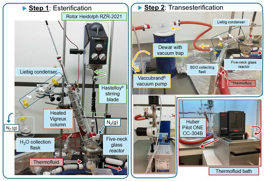 The reaction was carried out in a 100-mL glass-jacketed reactor with five necks, as shown in Figure 1. The reactor was connected to a Huber Pilot Pilot ONE CC-304B immersion bath (Peter Huber Kältemaschinenbau AG, Offenburg, Germany) for precise temperature control. A mechanical stirrer (Heidolph RZR-2021 rotor, Heidolph Instruments GmbH & Co. KG, Schwabach, Germany) and a Vigreux condenser column with a glass distillation adapter were connected through five necks. Further details of this oligomerization/polymerization unit can be found in the literature [22].