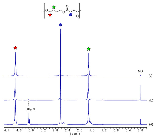 Proton nuclear magnetic resonance (1H-NMR) spectra with peak assignments of oligomers of butylene succinate (OBS) obtained at the end of the first esterification step (a) and after 1 h (b) and 2 h (c) of the transesterification step.