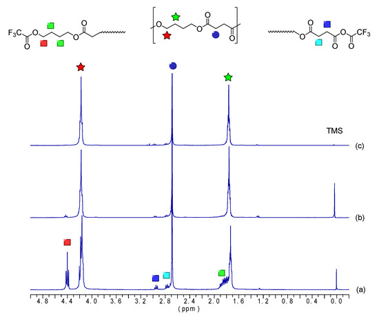 Proton nuclear magnetic resonance (1H-NMR) spectra with peak assignments of oligomers of butylene succinate (OBS) obtained at the end of the first esterification step (a) and after 1 h (b) and 2 h (c) of the transesterification step, after sample derivatization with trifluoroacetic anhydride to obtain the carboxyl end groups.