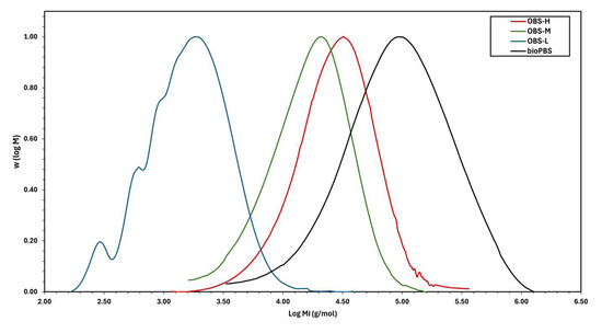 The molecular weights of the synthesized oligomers were also determined by GPC. In Figure 4, the ratio of the average molecular weight in the log scale [W (log Mi)] is represented as a function of the number-average molecular weight in the log scale (log Mi). These data were obtained from the signal heights and retention times in GPC elugrams. These plots represent the MWD of the three oligomers, which in all cases exhibited a monomodal and moderately symmetrical distribution with different average values of molecular weight. Table 2 also includes the values of both Mn and Mw obtained from the GPC measurements, confirming that the three oligomers have different molecular weights but similar dispersity. As expected, the OBS-H sample, which underwent the longest transesterification time (2 h), reached the highest molecular weight (Mn = 18,650 g·mol−1 and Mw = 33,147 g·mol−1), reflecting the effect of the longer reaction time on chain growth. Thus, OBS-L (Mn = 1150 g·mol−1 and Mw = 2100 g·mol−1) without transesterification and OBS-M (Mn = 8700 g·mol−1 and Mw = 16,150 g·mol−1) with a shorter transesterification time showed lower molecular weight values than OBS-H. Therefore, the transesterification step notably promoted chain growth, whereas smaller differences were observed between the oligomers produced after 1 h and 2 h of transesterification. Furthermore, the molecular weight values of both OBS-H and OBS-M were close to that of PBS, indicating that these samples may also be classified as either biopolyesters of low molecular weight or oligoesters of high molecular weight.