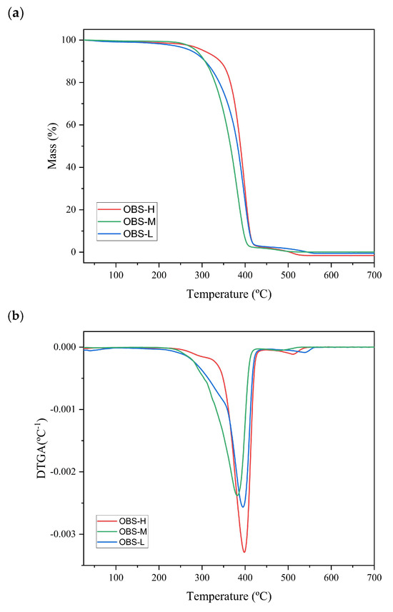 Figure 5 shows the TGA curves (Figure 5a) and their corresponding DTGA curves (Figure 5b) obtained for the three different oligomers, while Table 3 summarizes the parameters determined for each thermal degradation event. No significant weight loss occurred between 30 and 140 °C, confirming the lack of bound water and suggesting that no low-molecular-weight chains volatilized. The three oligomers exhibited different thermal stabilities depending on their molecular weights. In particular, the OBS-L, OBS-M, and OBS-H samples initiated thermal degradation at 183 °C, 223 °C, and 249 °C, respectively. Thus, low- and medium-molecular-weight oligomers showed the initiation of degradation at lower temperatures than the high-molecular-weight oligomer sample. This is consistent with the increase in thermostability with increasing molecular weight, with the highest stability being reached in longer-chain oligomers. However, their main thermal decomposition was similar in all cases, taking place in the 300–450 °C range, with a maximum degradation rate at Tpeak of nearly 400 °C, which is consistent with the findings reported previously by Gkountela et al. [27]. The lowest Tpeak was observed for OBS-M. In this regard, the presence of residual amounts of the metallic catalyst in the oligomers subjected to transesterification (OBS-M and OBS-H) could enhance the thermal degradation rate [41,42]. The final mass loss step at 450–550 °C can be attributed to the thermal decomposition of the organic compounds produced in the previous steps [2,43]. Therefore, as expected, the molecular weight of the oligoesters influenced their thermal stability, which is particularly relevant for the OBS-L sample because thermal degradation initiates at a temperature closer to the processing temperature of PBS (~150 °C) [44].