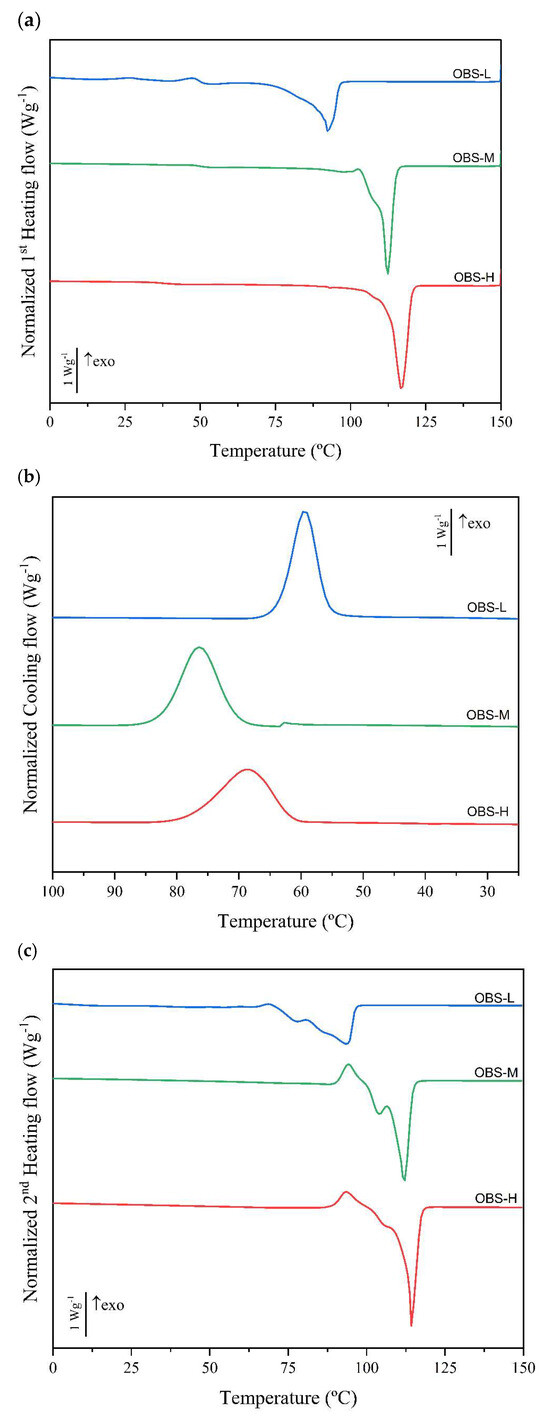 The first- and second-order phase transitions of the oligomers were analyzed using DSC. The cooling and heating thermograms obtained for the three oligomers (OBS-H, OBS-M, and OBS-L) are shown in Figure 6, whereas Table 4 summarizes the thermal transition values. During the first heating step (Figure 6a), all oligomers exhibited a low-intense thermal transition from 25 °C to 40 °C. This second-order transition has been ascribed to the glass transition corresponding to the rigid amorphous fraction (RAF) of the PBS molecules adjacent to the crystal surface, which shows a higher degree of mobility restriction, and occurs approximately at 50 °C, well above the main biopolyester’s Tg [2]. In the case of the OBS-H and OBS-M samples, this second Tg was centered at nearly 35 °C, whereas for OBS-L, it was difficult to elucidate because it overlapped with low-intensity cold crystallization peaks. In this regard, it was recently reported that RAF in PBS “devitrifies” at about 25 °C [45], which excludes any possible contribution of the RAF to the PBS melting. At higher temperatures, all oligomers melted, yielding different melting temperature (Tm) values that increased with the degree of oligomerization and, hence, were strongly influenced by their molecular weight. In particular, Tm values of 94.5 °C, 112 °C, and 117.2 °C were attained for the OBS-L, OBS-M, and OBS-H samples, respectively. Melting was also observed in the form of broad peaks, indicating the presence of a wide range of crystal sizes and/or multiple phenomena of melting—recrystallization—melting in the oligomers [46,47]. In this regard, one should consider that this first thermal scan was mainly aimed at removing the thermal history of the samples, since these crystallized in the reactor under uncontrolled conditions, but it was also analyzed to better indicate the thermal response of the different oligomers.
