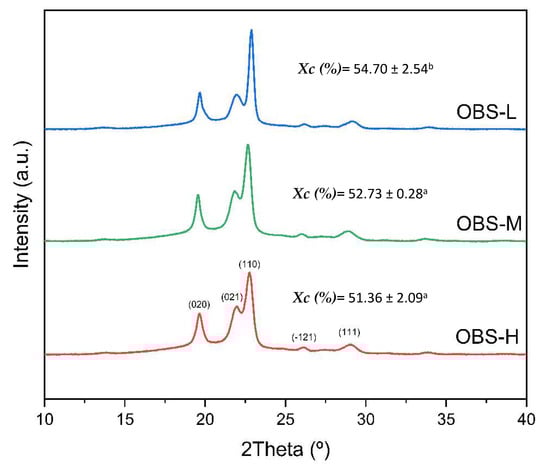 Finally, the crystallinity percentage or Xc of the synthesized oligomer samples (OBS-H, OBS-M, and OBS-L) was determined from their normalized enthalpies of melting. To this end, different reference values of ΔH°m reported for PBS were employed. The three oligomer samples presented ΔHm values in the 70–80 J/g range, without significant differences (p > 0.05) between them, but slightly higher for the OBS-L. Table 4 also shows the Xc values based on the reported ΔH°m values of 110.3 J/g [27] and 102 J/g [28], whose values ranged from approximately 64% to 78%. However, taking ΔH°m as 200 J/g [30,31] resulted in a crystallinity degree in the range of 35–40%. These values are similar to those reported in our previous study for fully bio-based PBS (Xc = 36.2 ± 1.7%) [16]. Similarly, Gkountela et al. [27] reached crystallinity percentages of 73% and 67% for OBS with 1150 g⋅mol−1 and 1400 g⋅mol−1, respectively, using ΔH°m values of 110.3 J/g. Due to the large differences in the Xc values and the lack of any specific ΔH°m reference for OBS, the crystallinity of the oligomers was elucidated by X-ray diffraction. The DSC results suggest that the molecular weight of OBS has a minor effect on its crystallinity.