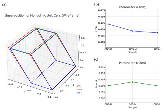 (a) Monoclinic unit cells of oligo(butylene succinate) with high (OBS-H), medium (OBS-M), and low (OBS-L) molecular weights with the evolution of their (b) a, (c) b, and (d) c lattice dimensions, and (e) β angle parameter.