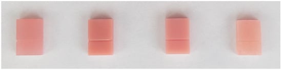 Samples prepared using evaluated materials—from the left side: Denture 3D+, NextDent; Denturetec, Saremco; Optiprint Laviva, Dentona; Rapid Simplified, Vertex Dental.
