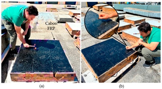 Tap testing on carbon FRP-retrofitted concrete slab. (a) Tapping with a hammer to detect subsurface defects, (b) coin tapping used to identify tonal variations indicating possible debonding. All images were adopted from [11].
