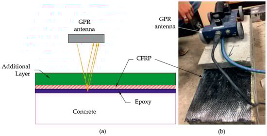 Ground-Penetrating Radar (GPR) principle of work; (a) GPR scanning setup, (b) laboratory setup with GPR antenna scanning over the EB-CFRP specimen All images adopted from [51].