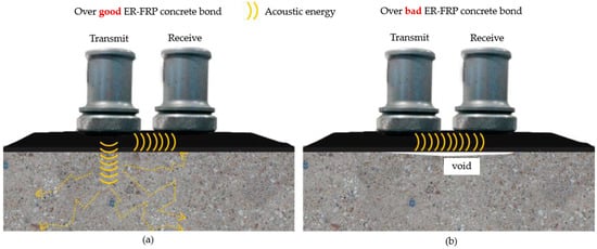 Ultrasonic wave behavior over ER-FRP concrete bonds; (a) over a good bond, and (b) over a bad bond with a void. Yellow arrows indicate the propagation path of acoustic energy used for defect detection. All images adopted from [71].