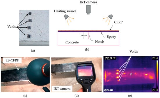 Setup and detection of artificially introduced voids in EB-FRP-strengthened concrete beams using IRT: (a) artificially embedded voids in concrete surface, (b) schematic diagram of IRT setup showing heating source, CFRP layer, and detection configuration, (c) surface heating, (d) capturing thermograph image, (e) thermograph of sample. All images adopted from [51].