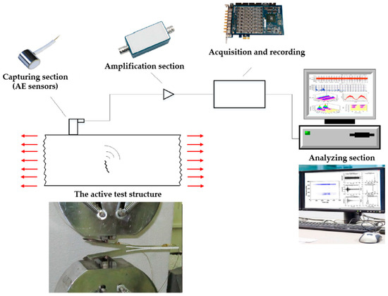The different units of an AE monitoring system. The red arrows indicate the stress waves emitted from the structure under mechanical loading. These waves are detected by the AE sensors during the AE monitoring process [89].
