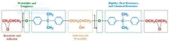 Epoxy resin (EP) is one of the most widely consumed thermosetting resins among major commercial resins, distinguished by its extensive variety, flexible formulation design, and broad application range [1]. Epoxy resins are high-performance thermosetting polymers characterized by the presence of two or more epoxy groups within their molecular structure, typically based on aliphatic, cycloaliphatic, or aromatic carbon chains [2,3,4] (Figure 1). The epoxy groups (-C2H4O-) at a molecular level provide notable reactivity and exceptional adhesive properties to the resin. The presence of the benzene ring structure adds high rigidity, heat resistance, and chemical stability, guaranteeing that cured epoxy resins maintain consistent mechanical properties even at high temperatures. Moreover, the inclusion of ether bonds (-O-) and hydroxyl groups (-OH) improves the resin’s capacity to be wetted, hence promoting stronger chemical interaction with the surfaces of substrates. Hydroxyl groups facilitate hydrogen bonding with other molecules, hence enhancing intermolecular interactions and overall material performance. Epoxy resins has exceptional properties such as strong adhesion, resistance to wear, effective electrical insulation, chemical stability, capacity to withstand high and low temperatures, dimensional stability, ease of processing, and affordability. These qualities make epoxy resins very versatile and suitable for use in a wide range of industries and applications [5,6,7].
