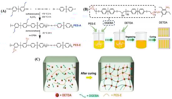 (A) Synthesis process of PES-E; (B) synthesis of PES-E/DGEBA composite; (C) schematic illustration of crosslink network formation of PES-E/DGEBA composite. Reproduced from Ref. [65] with permission of John Wiley and Sons.