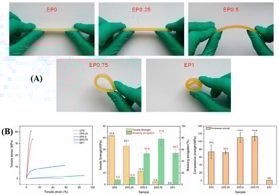 Effect of various CTBN contents on the mechanical properties of composite materials: (A) tensile strength and tensile modulus; (B) elongation at break and impact strength. Reproduced from Ref. [38] with permission of MDPI. (C) OH group chemistry diagram of EP group and EHTPB; (D) tensile strength and fracture elongation. Reproduced from Ref. [40] with permission of John Wiley and Sons.