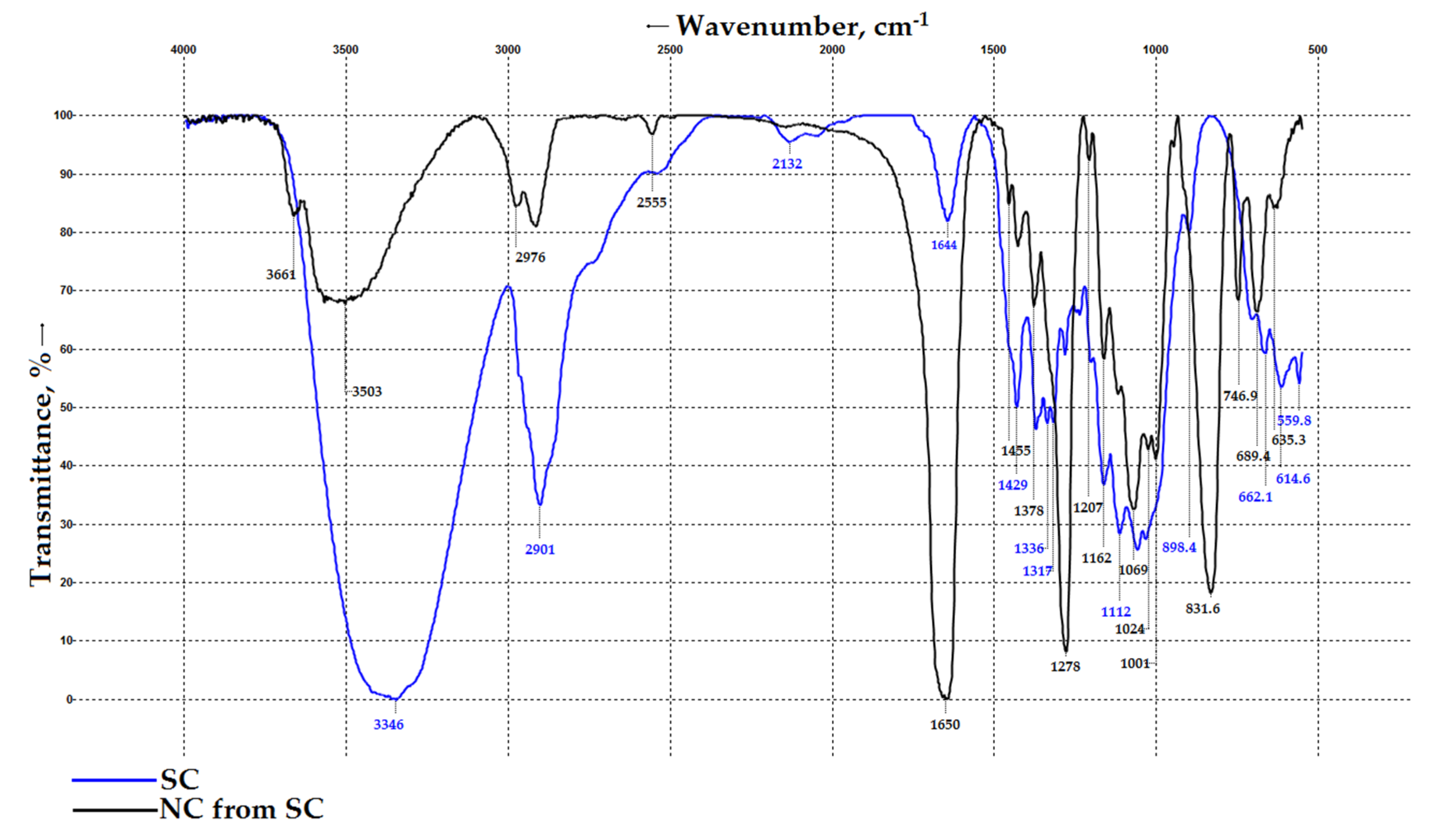3.4. FT-IR Spectroscopy Results for SC and SC-Based NC