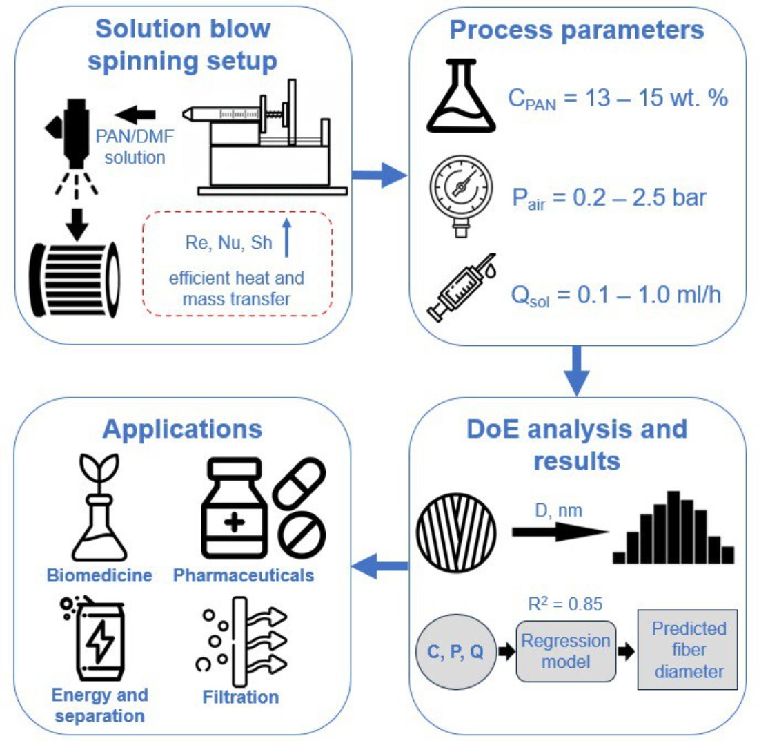 Menshutina, N.; Kunaev, D.; Abramov, A.; Aleksandr, A. Polyacrylonitrile Nanofiber Mats Produced by Solution Blow Spinning: Influence of Process Parameters on Fiber Diameter and Residual Solvent Content. Polymers 2026, 18, 100. https://doi.org/10.3390/polym18010100