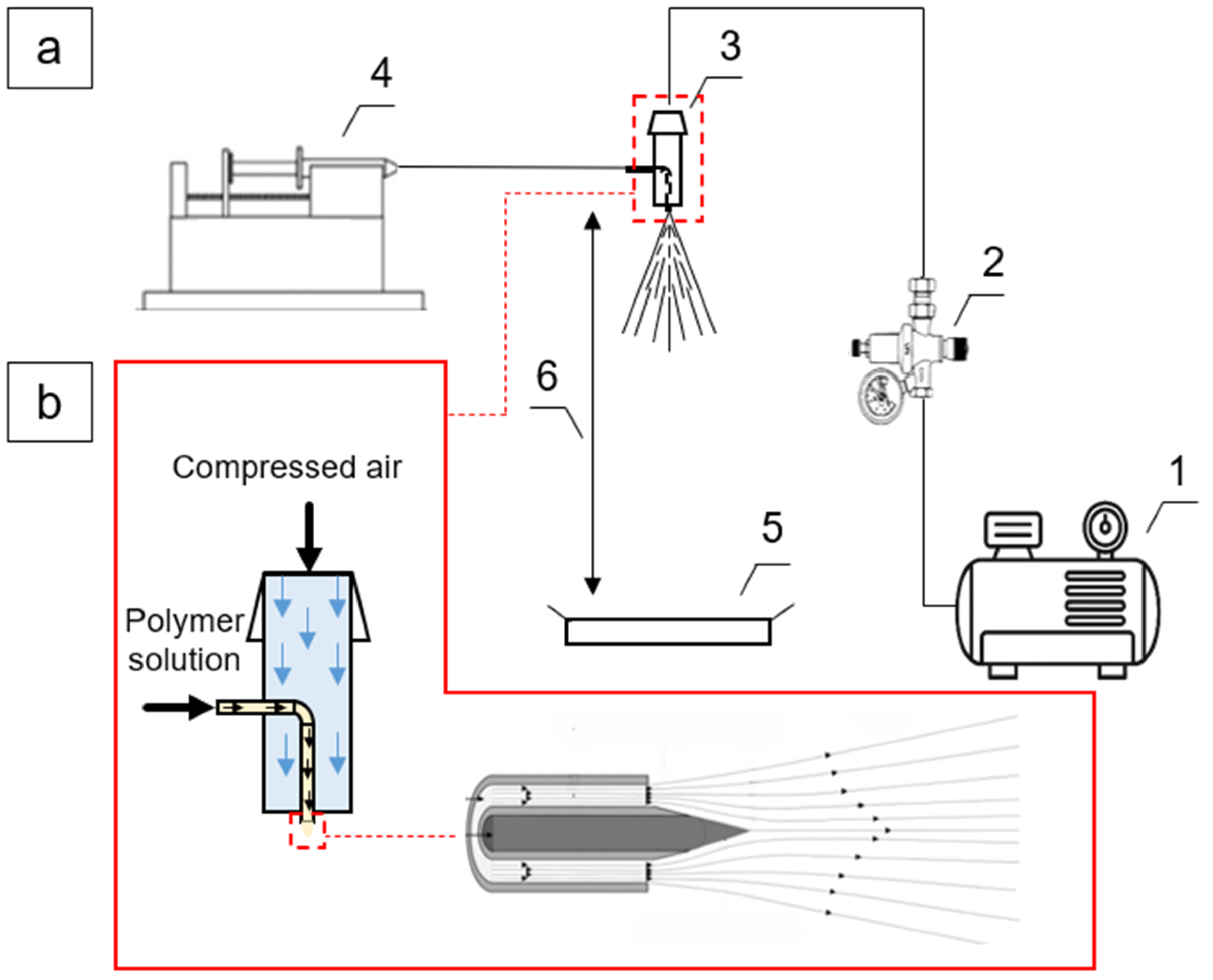 - Mobaraki, M.; Liu, M.; Masoud, A.R.; Mills, D.K. Biomedical Applications of Blow-Spun Coatings, Mats, and Scaffolds—A Mini-Review. J. Compos. Sci. 2023, 7, 86. [Google Scholar] [CrossRef]