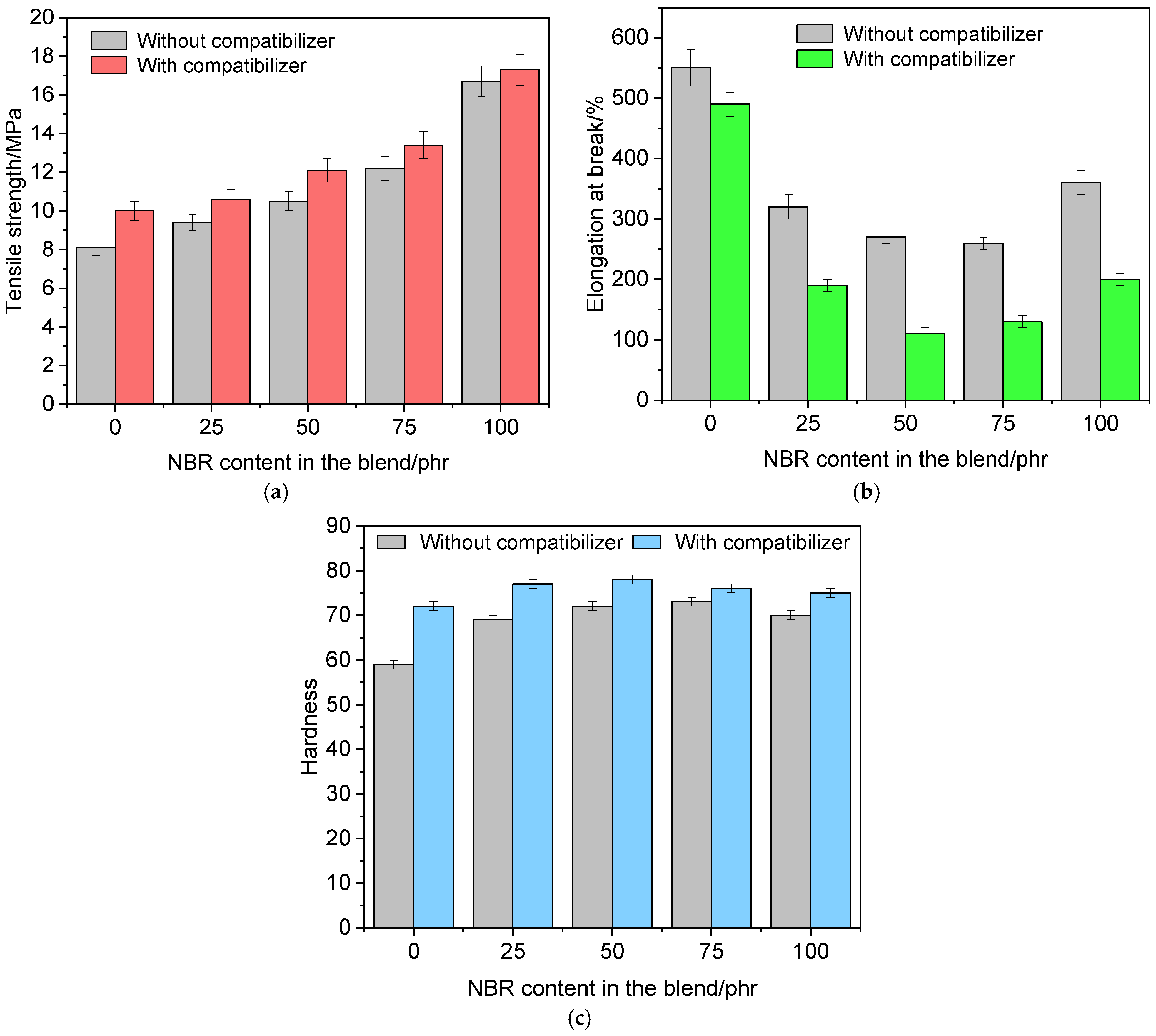 - Botros, S.H.; Tawfic, M.L. Synthesis and Characteristics of MAH-g-EPDM Compatibilized EPDM/NBR Rubber Blends. J. Elastomers Plast. 2006, 38, 349–365. [Google Scholar] [CrossRef]