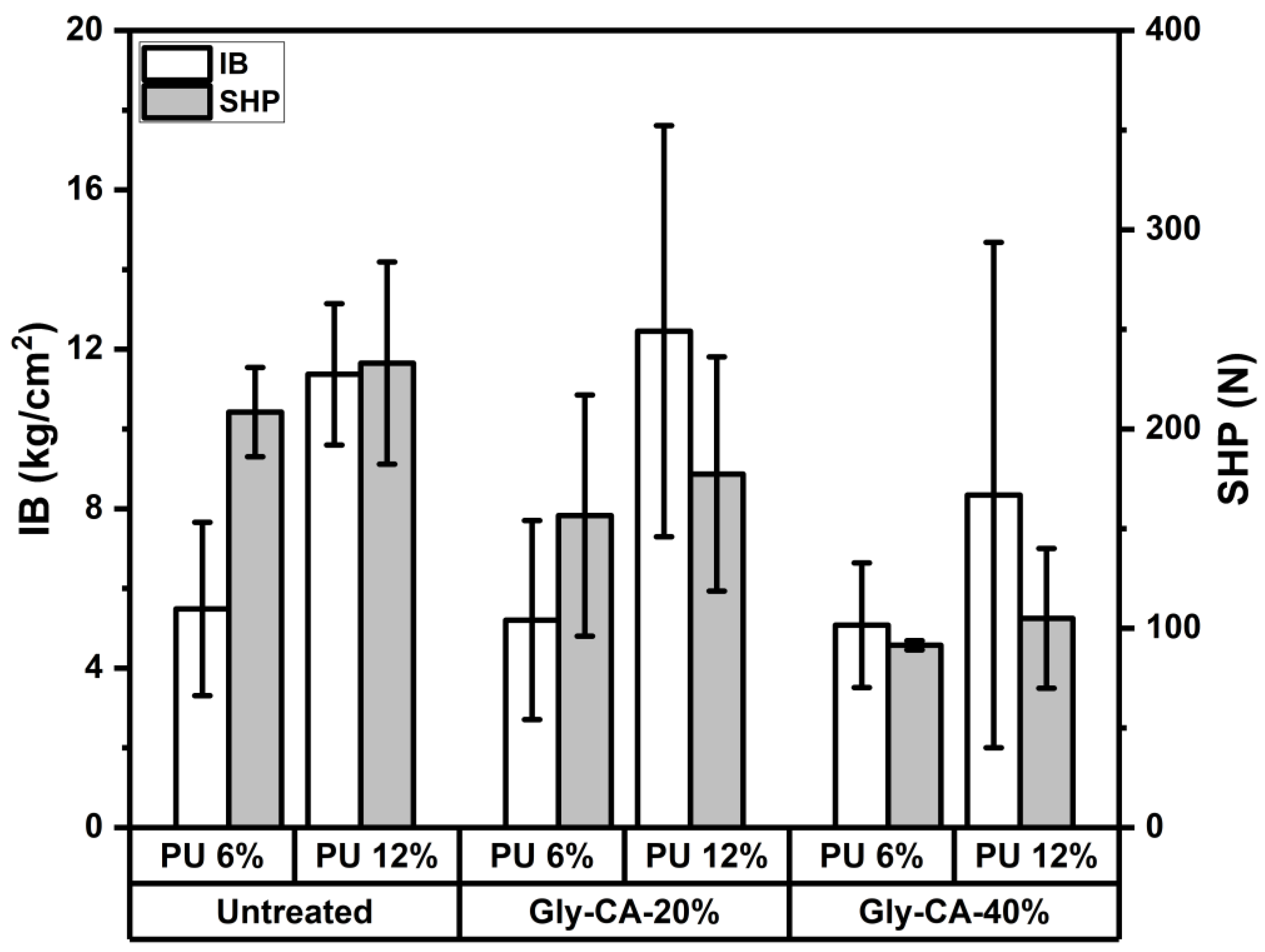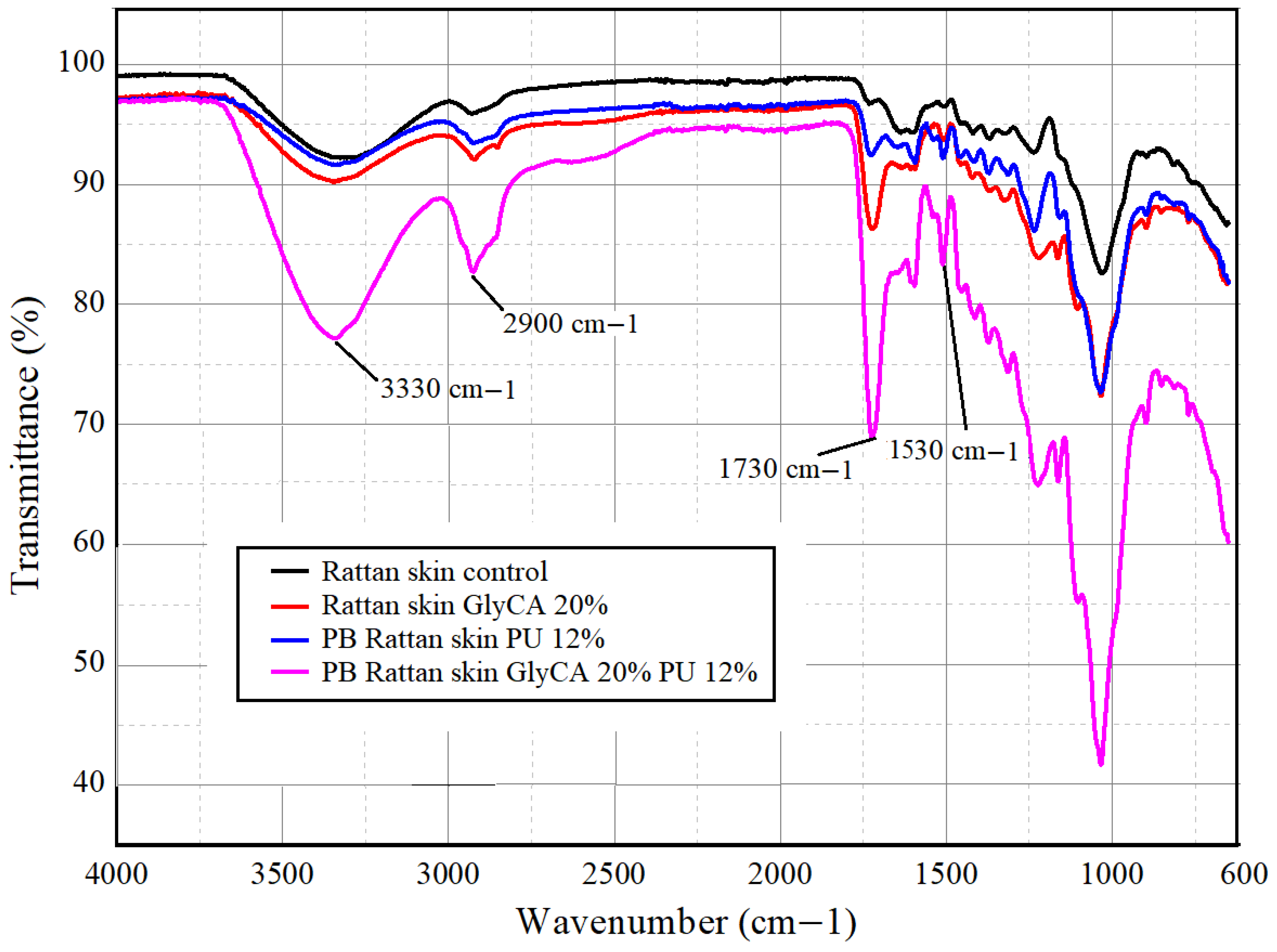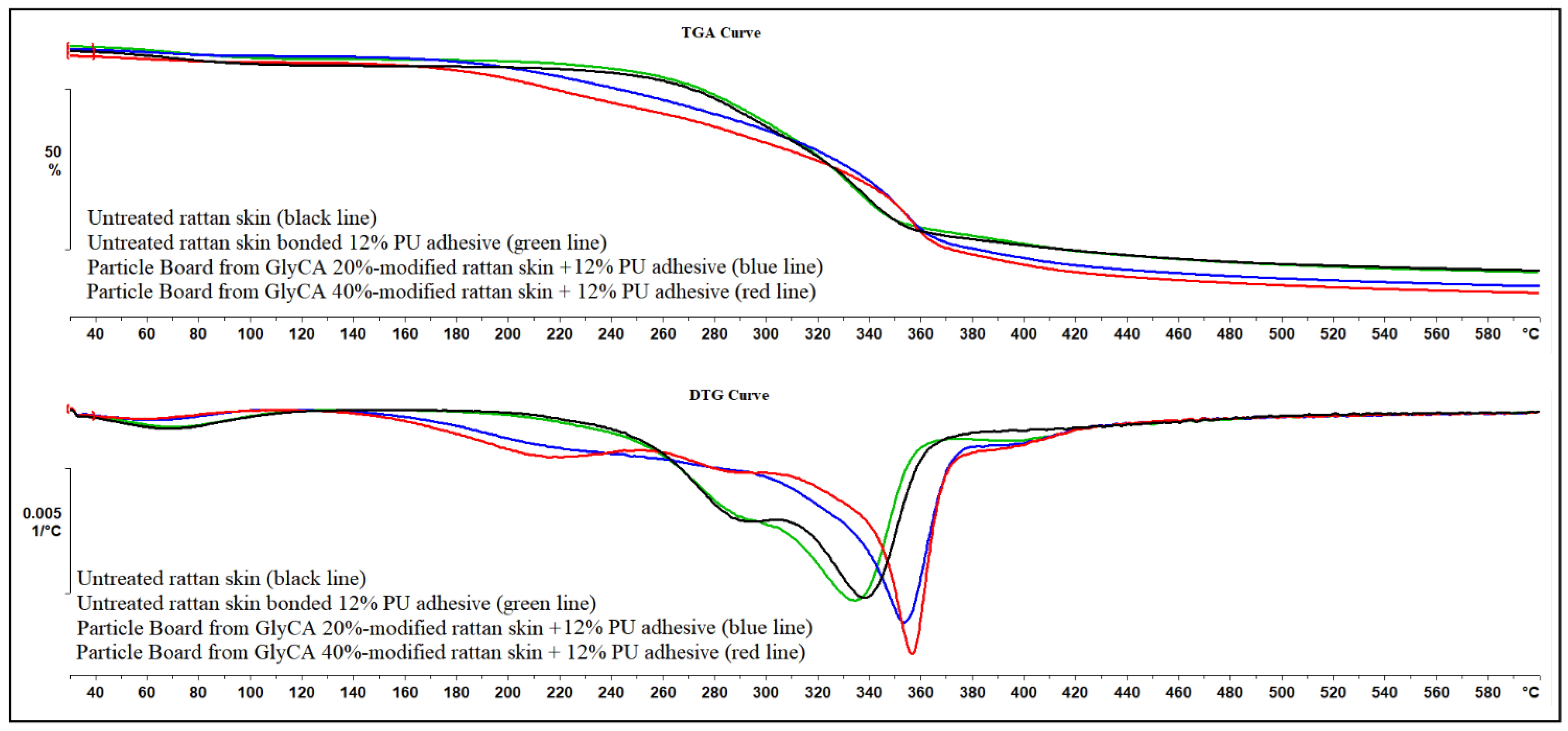 | PB (Untreated Rattan Skin + PU 12%) (Green line) | −51.00% | 106.9–420.3 | 334.5 | 325.1 | PU adhesive increases char, slightly improves stability |