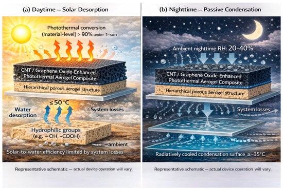However, the net benefit of added hydrophilicity, achieved through functional groups such as silanols in silica, hydroxyl (–OH) in cellulose, or amines (–NH2) in chitosan, is often offset by accelerated structural fatigue during wet–dry cycling. While these groups enhance low RH affinity and water uptake via hydrogen bonding, they also amplify capillary stress, leading to mechanical degradation. This critical trade-off is underreported in 78% of studies (Supplementary Table S4) and rarely quantified beyond 100 cycles. Meanwhile, the ultra-low thermal conductivity of aerogels (less than 0.02 W·m−1·K−1) provides excellent thermal insulation, which, when combined with photothermal additives such as carbon nanotubes, graphene, or MXenes, enables efficient solar-driven desorption at temperatures as low as 40 to 50 °C. Together, these mechanisms, validated across numerous studies [31,32,33], form the scientific foundation for high-performance AWH under idealized conditions.