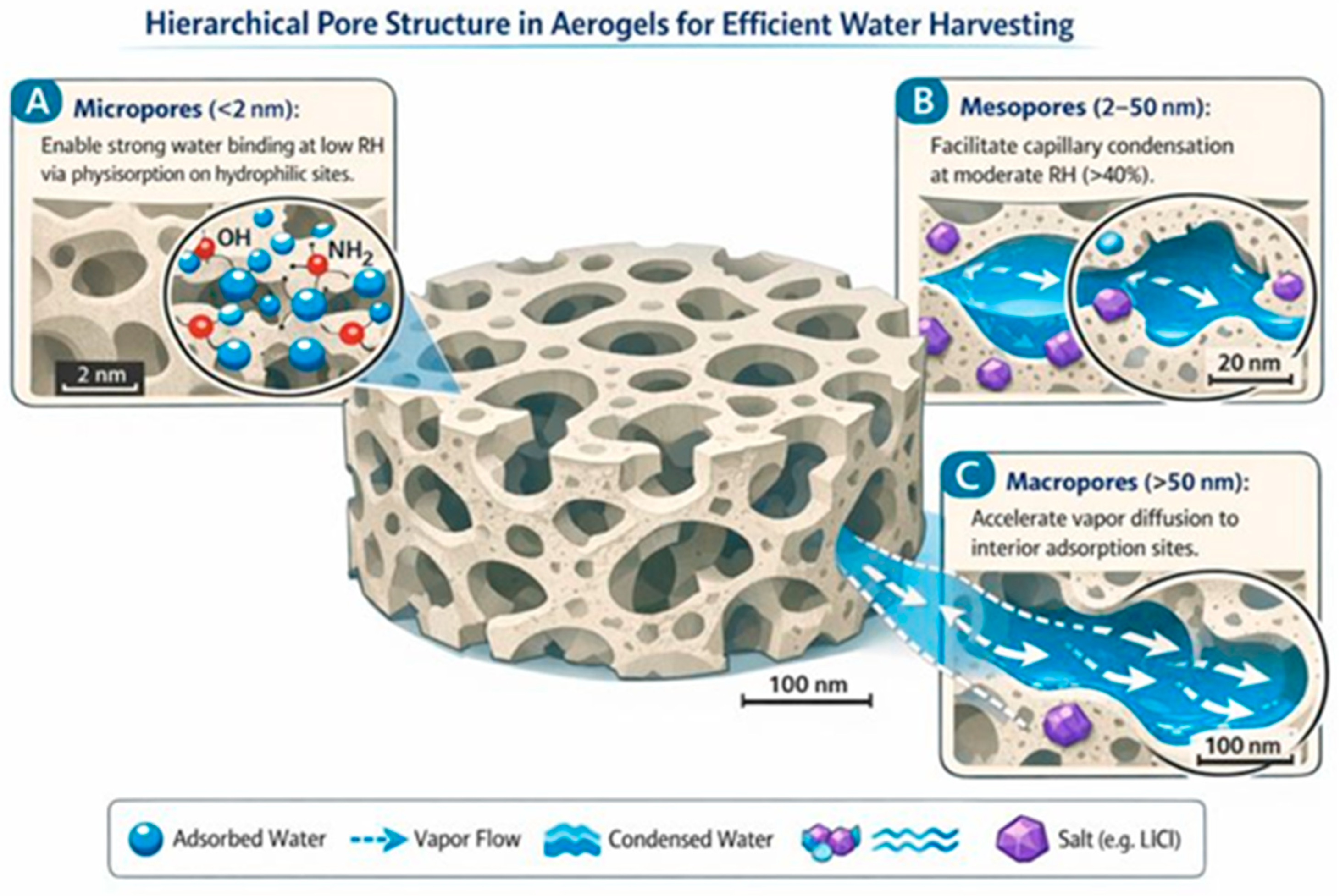 Aerogels offer distinct advantages over conventional adsorbents, including tunable porosity, low thermal conductivity, and composite flexibility. These properties allow their surface chemistry, pore architecture, and composite structure to be precisely engineered for optimal water harvesting performance across diverse climates [