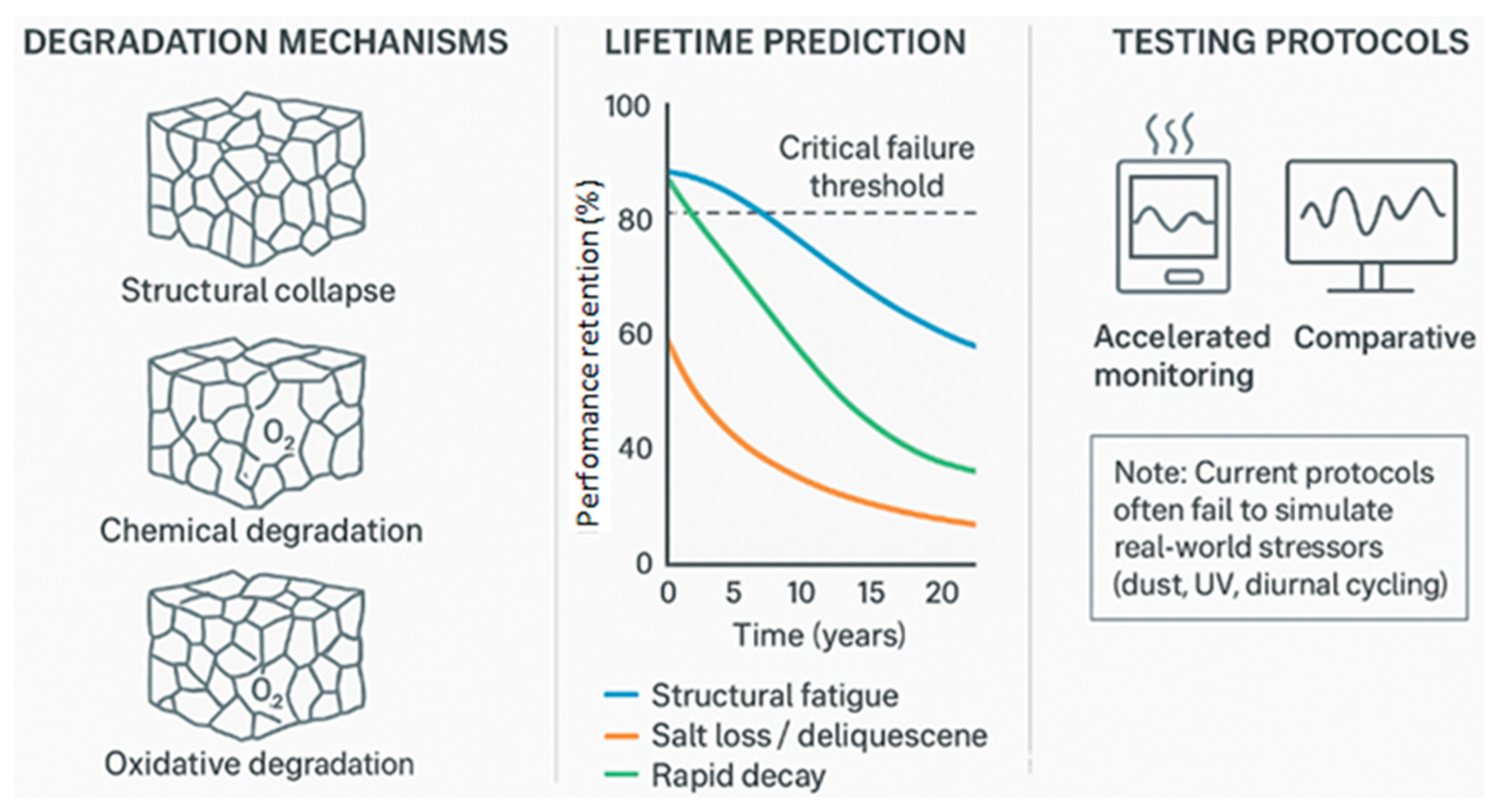 Finally, the safety and regulatory acceptability of harvested water must be addressed. Sorption-based AWH systems risk contamination from salt carryover, adsorption and release of volatile organic compounds (VOCs), and microbial biofilm growth during humid cycling. These pathways are rarely monitored in current research but are critical for potability, public health, and regulatory compliance, especially in off-grid and emergency settings where post-treatment infrastructure is absent.