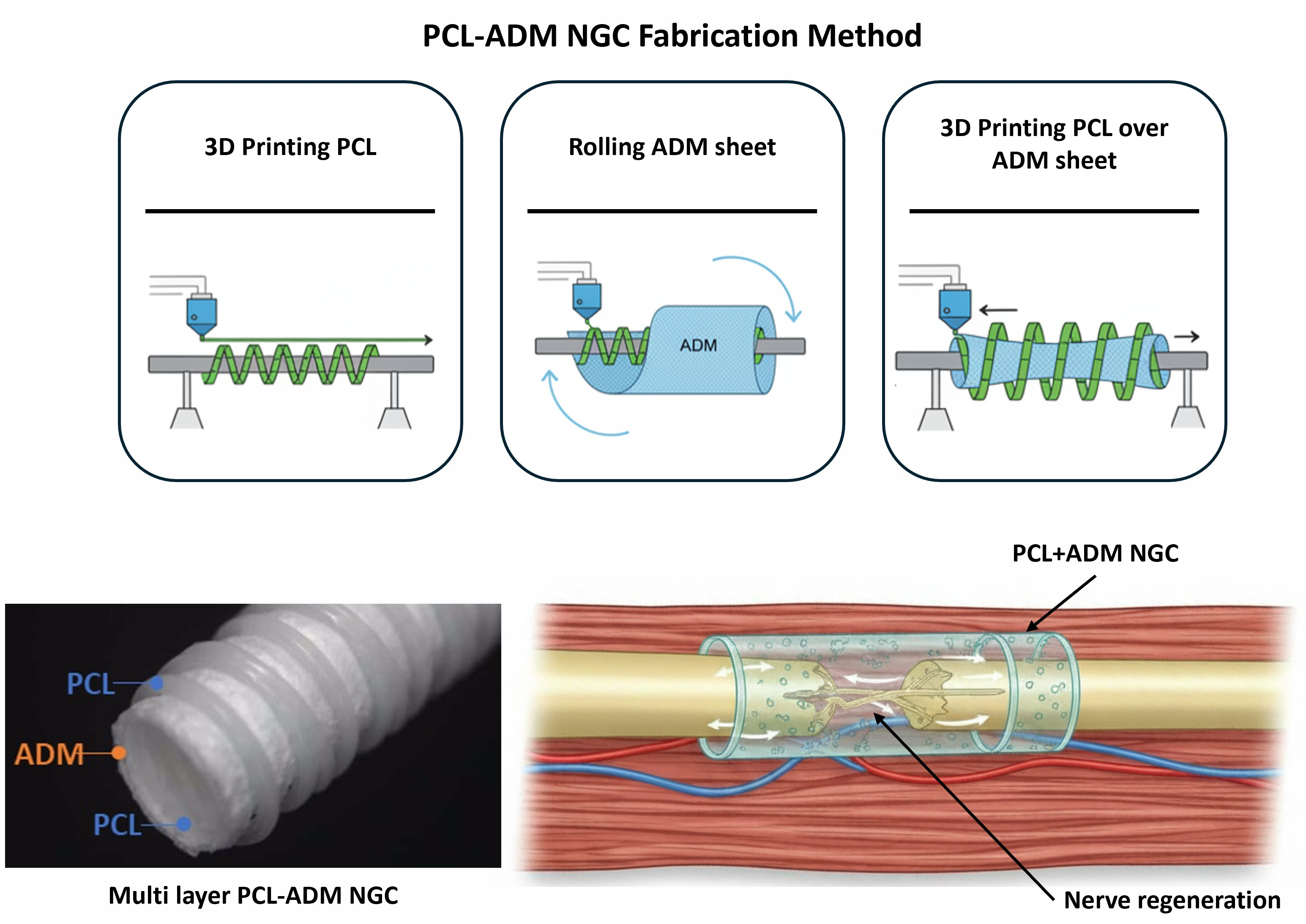 Our in vivo results demonstrated that the PCL-ADM NGC showed promising outcomes comparable to those achieved with conventional approaches such as silicone tube repair and autologous nerve grafting. Electrophysiological and histological evaluations specifically indicated that the conduit supported enhanced axonal regeneration and functional recovery. Collectively, these findings suggest that the PCL–ADM NGC may serve as a viable alternative to current nerve repair strategies.