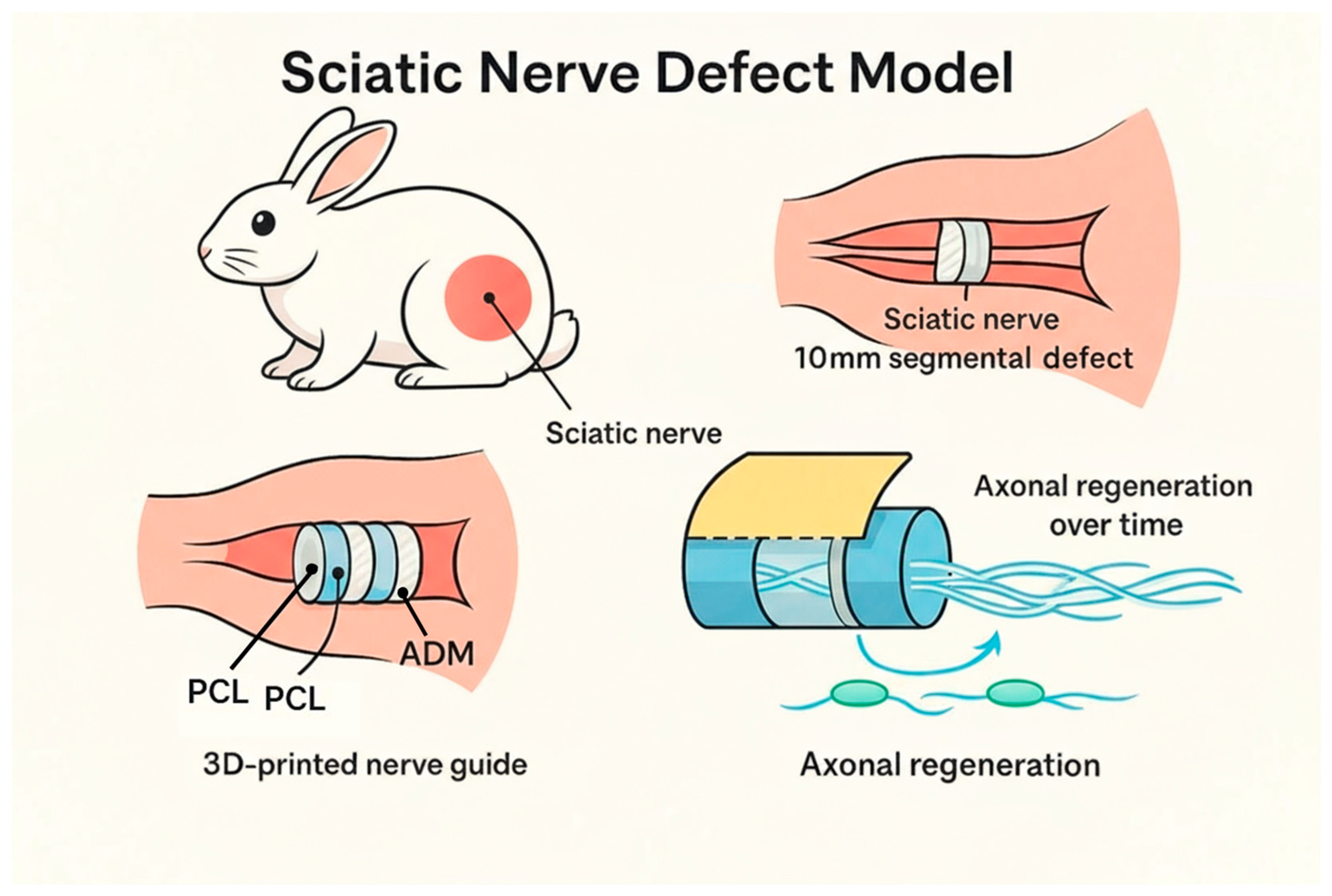 In this study, we investigated the efficacy of a novel 3D-printed NGC made from porcine acellular dermal matrices and polycaprolactone (PCL) in repairing sciatic nerve injuries in rabbits.
