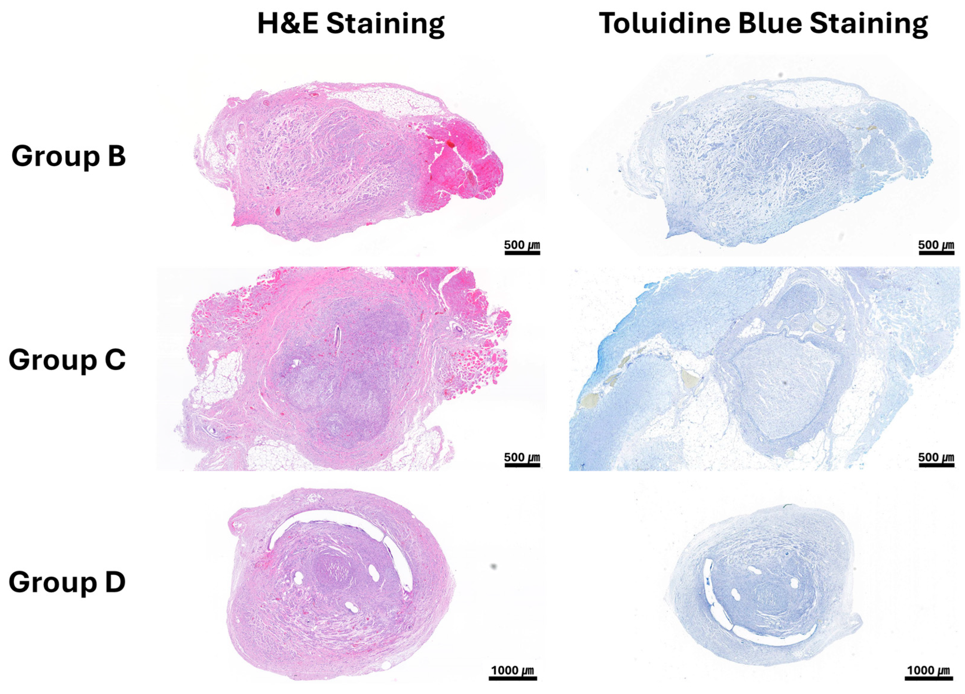 All animal experiments were approved by the Institutional Animal Care and Use Committee (IACUC) of Asan Medical Center, Seoul, Republic of Korea (Approval No. [2023-12-035]). In accordance with the 3Rs principle of reduction, negative control animals (n = 3) were maintained at the minimum necessary number to provide baseline comparison while minimizing animal use. Experimental group sample sizes were unequal (n= 5 to 6) due to perioperative anesthesia-related losses during surgery, recovery, and dressing procedures.