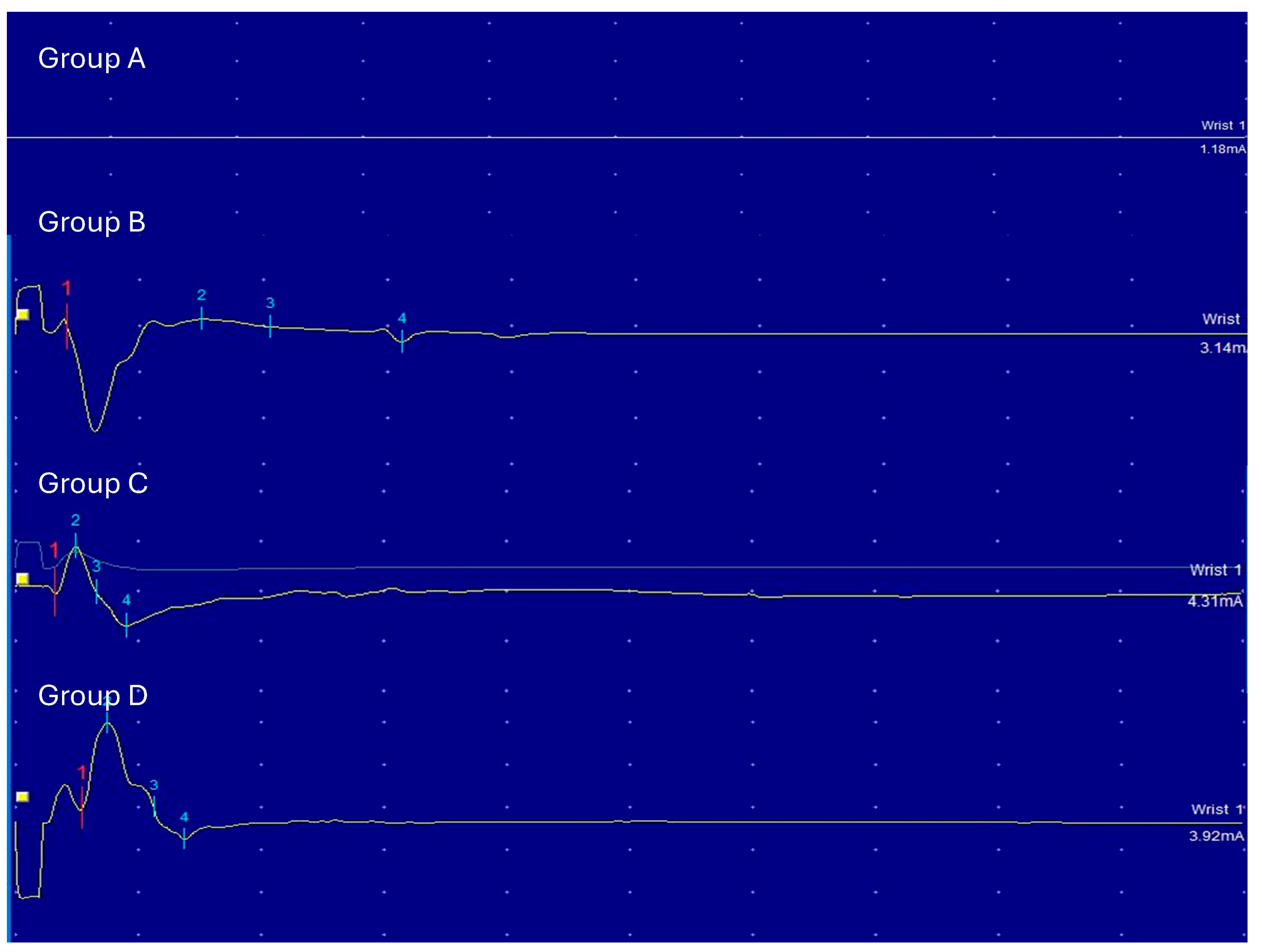 The electrophysiological evaluation was performed with the electromyography after 4 and 12 weeks. Electrical activity was recorded from the gastrocnemius muscle innervated by the tibial nerve and the distal branch of the sciatic nerve. The evoked response in this muscle could reflect the innervation across the nerve coaptation.