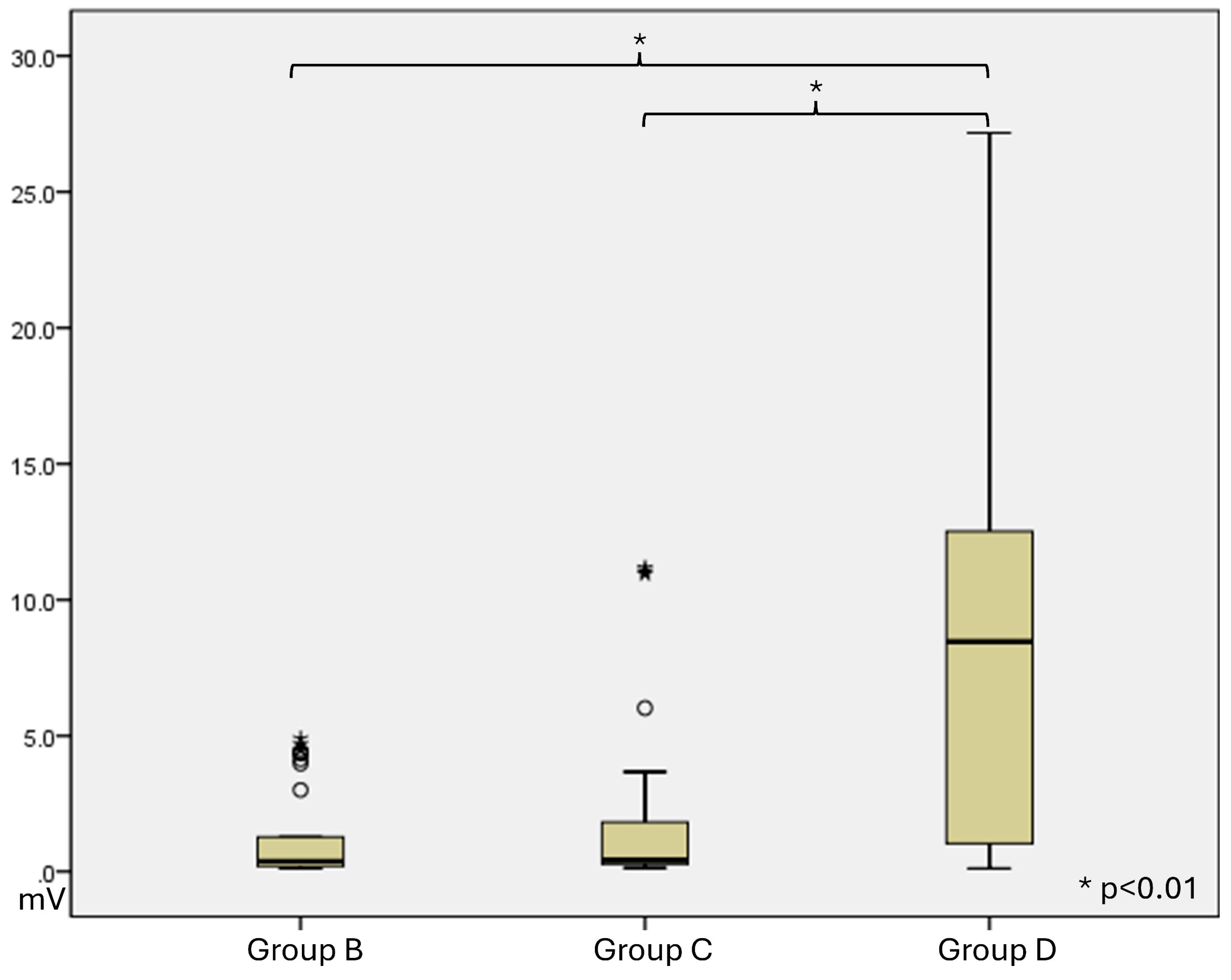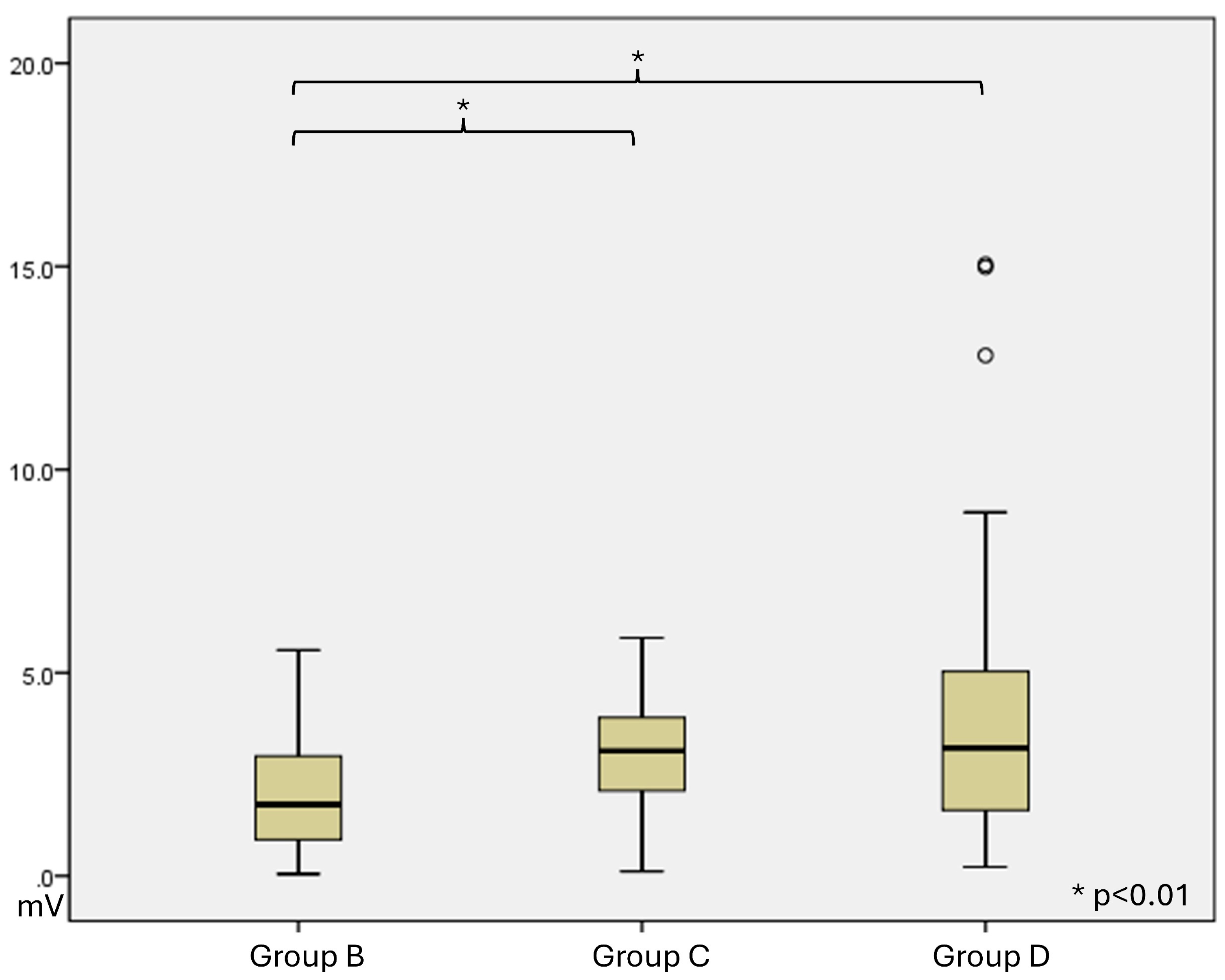 The axonal count analysis revealed that Group D (NGC) exhibited numbers of myelinated and non-myelinated axons comparable to those observed in Group C (autologous graft), with both groups outperforming the silicone tube in Group B. These findings underscore the NGC’s capacity to support axonal regeneration while mitigating risks such as neuroma formation and fascicular mismatch. The comparable axon counts between Groups C and D suggest that the PCL-ADM NGC may provide reconstruction efficacy approaching that of autologous grafting, but without the need for donor nerve harvest, thereby reducing donor site morbidity.