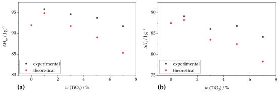 Dependence of TiO2 mass portion in PHBV/TiO2 nanocomposites on: (a) enthalpy of fusion change; (b) crystallization enthalpy change.