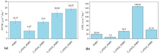 Results of (a) WVTR and (b) OTR measurements of the pure PHBV and PHBV/TiO2 nanocomposites.