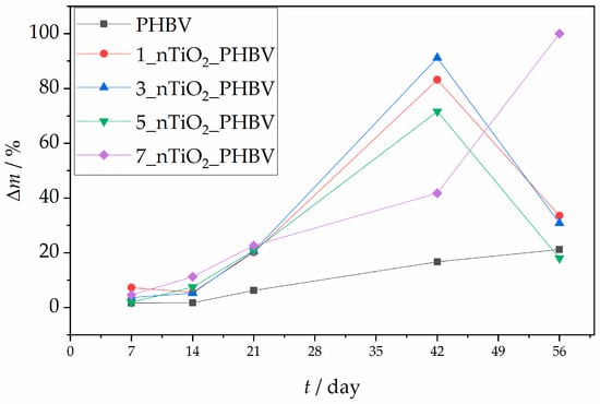 - Antunes, A.; Popelka, A.; Aljarod, O.; Hassan, M.K.; Kasak, P. Accelerated weathering effects on poly(3-hydroxybutyrate-co-3-hydroxyvalerate) (PHBV) and PHBV/TiO2 nanocomposites. Polymers 2020, 12, 1743. [Google Scholar] [CrossRef] [PubMed]