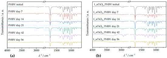 FTIR spectra obtained before (initial) and after 7, 14, 21, 42, and 56 days of biodegradation of (a) the pure PHBV; (b) 1_nTiO2_PHBV; (c) 3_nTiO2_PHBV; (d) 5_nTiO2_PHBV; (e) 7_nTiO2_PHBV.