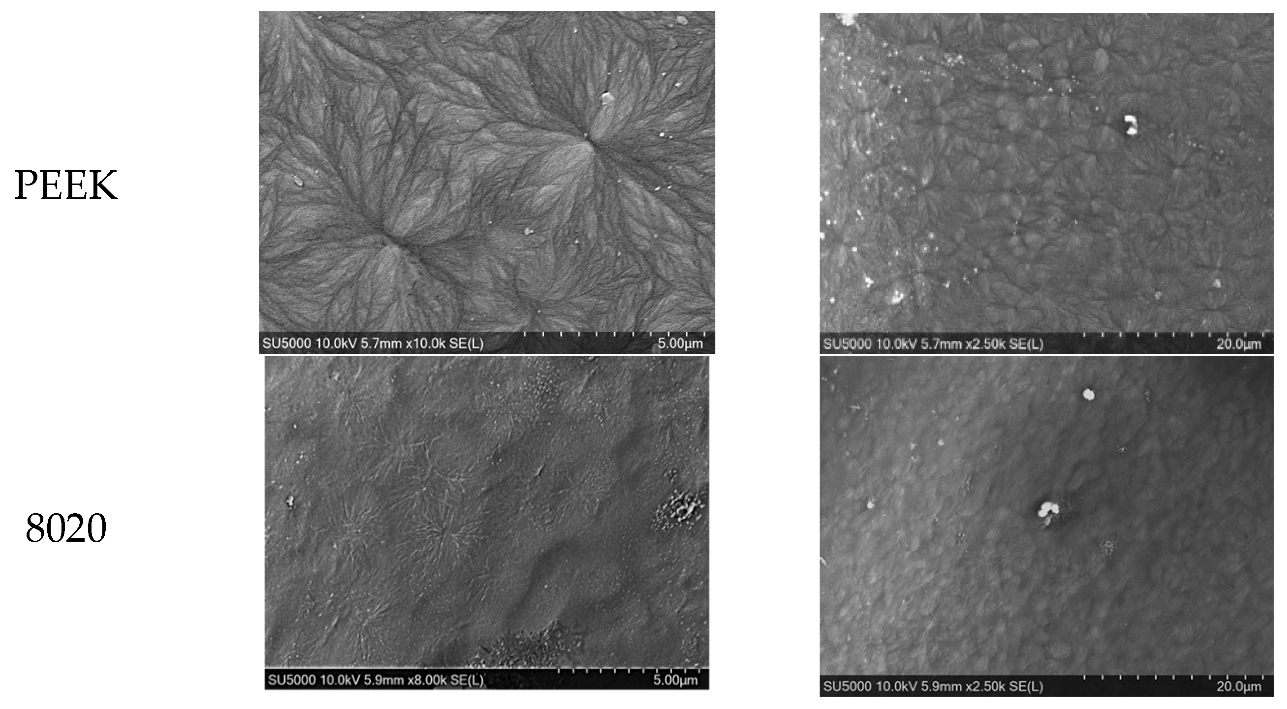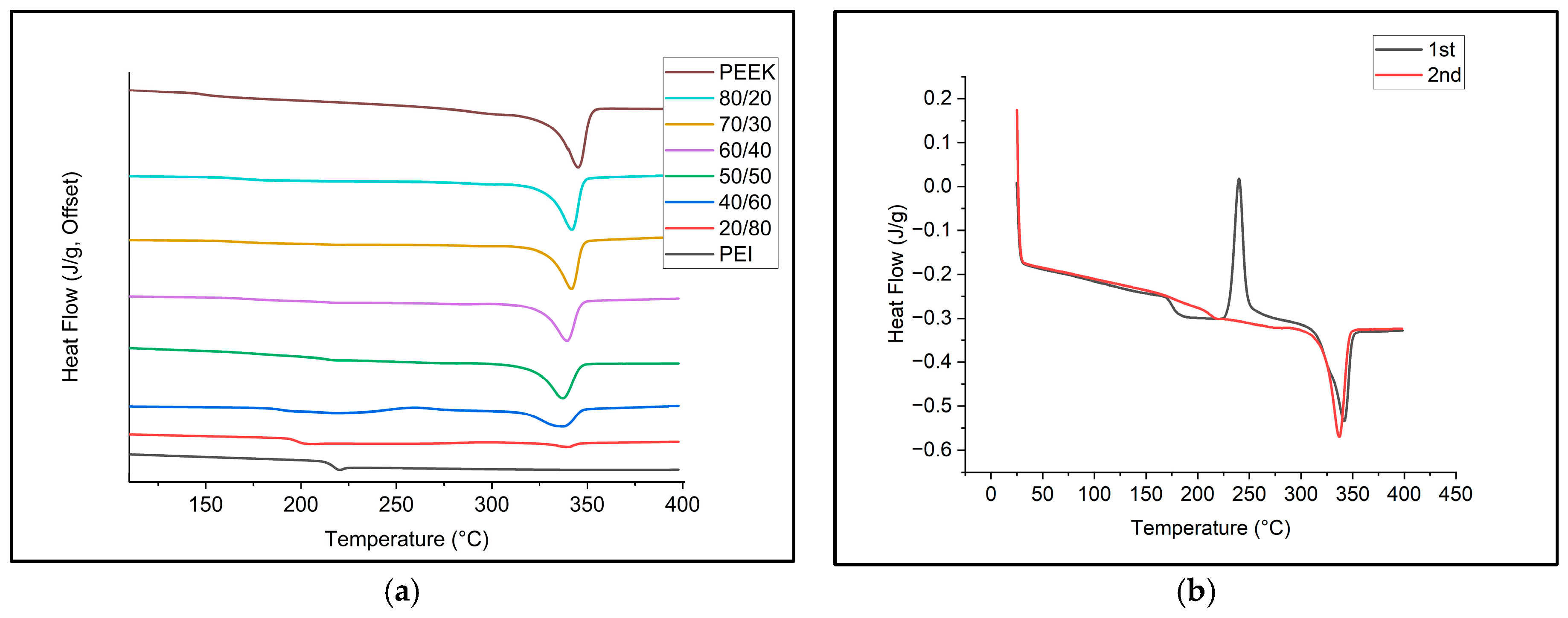 - Crevecoeur, G.; Groeninckx, G. Binary Blends of Poly(Ether Ether Ketone) and Poly(Ether Imide): Miscibility, Crystallization Behavior, and Semicrystalline Morphology. Macromolecules 1991, 24, 1190–1195. [Google Scholar] [CrossRef]