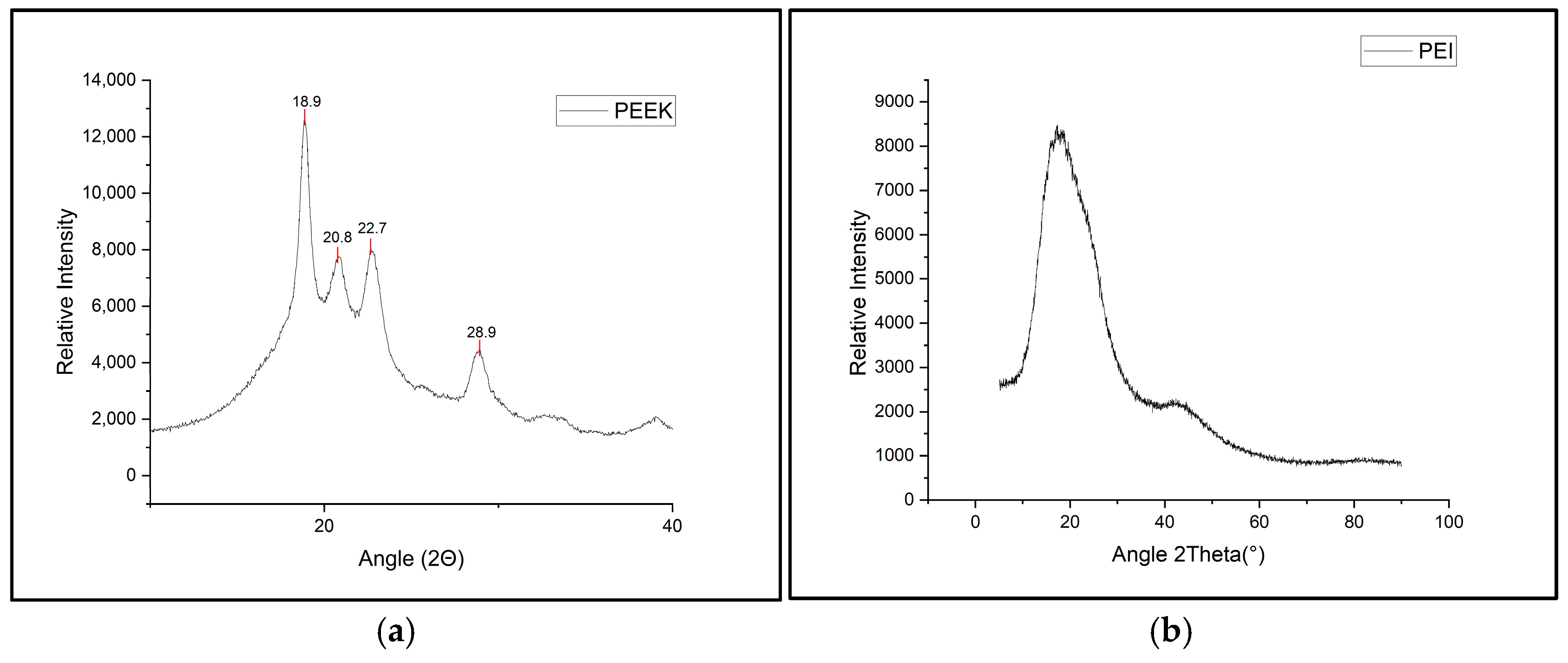 - McCrickard, C.; Boyd, A.; Archer, E.; Manzoor, F.; Ullah, J. Polyether ether ketone (PEEK) and polyetherimide (PEI) for fused filament fabrication (FFF) in medical applications. Int. J. Adv. Manuf. Technol. 2025, 140, 5737–5754. [Google Scholar] [CrossRef]