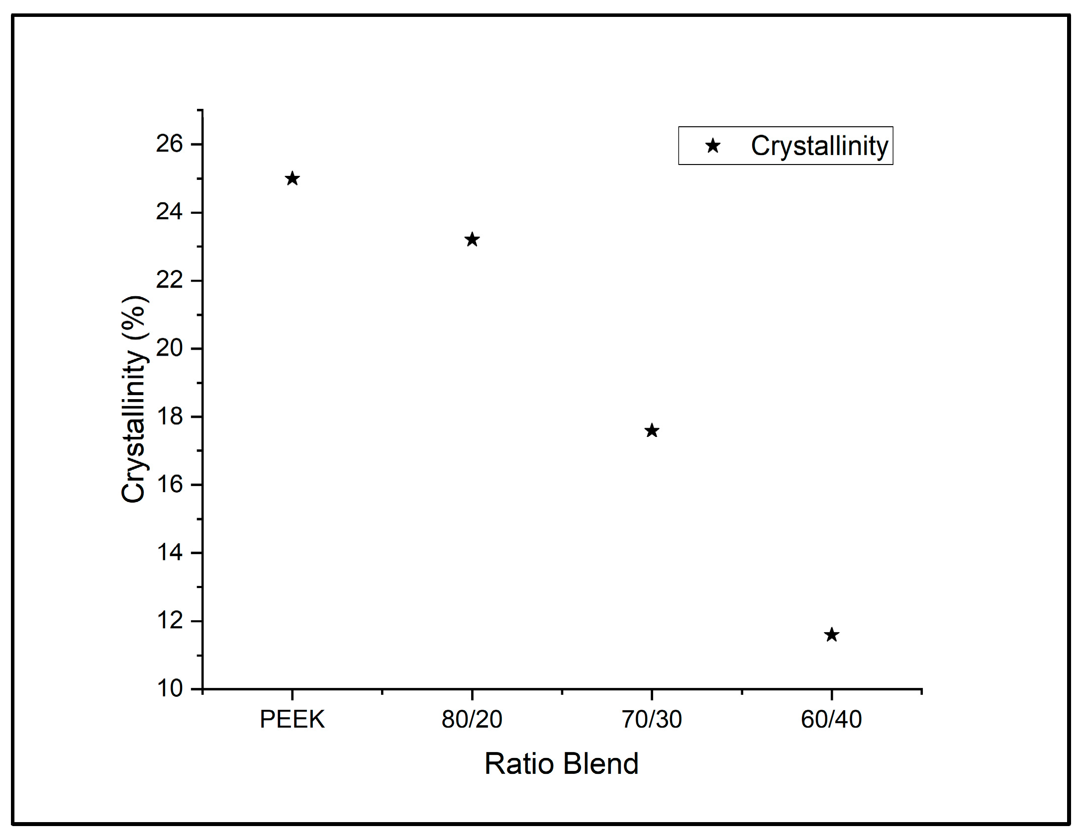 - El Magri, A. Investigating the tensile properties and crystallinity of 3D-printed poly (ether ether ketone)/poly (ether imide) [PEEK/PEI] blend in the Z-direction by fused filament fabrication. Prog. Addit. Manuf. 2024, 10, 2351–2367. [Google Scholar] [CrossRef]
