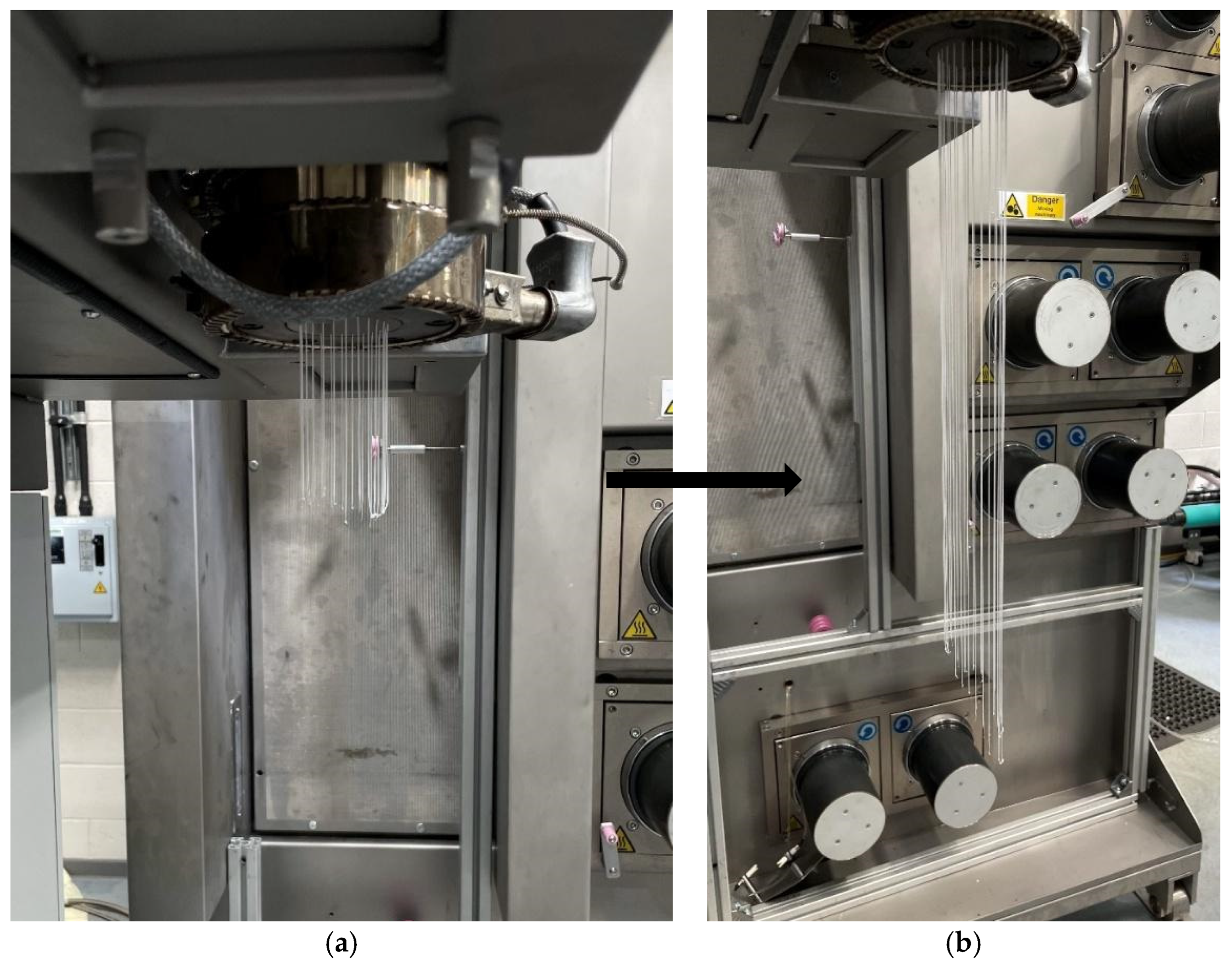 - Xia, X.; Wang, J.; Wang, H.; Zhang, Y. Numerical Investigation of Spinneret Geometric Effect on Spinning Dynamics of Dry-jet Wet-spinning of Cellulose/[BMIM] Cl Solution. J. Appl. Polym. Sci. 2016, 133, 43962. [Google Scholar] [CrossRef]