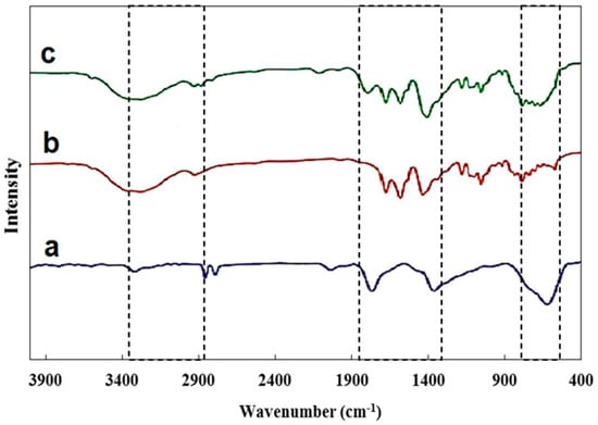 The FT-IR spectra of developed composite are shown in Figure 3. The existence of magnetic graphene oxide is confirmed by characteristic peaks seen at about 1439 cm−1, 1676 cm−1, and 2862 cm−1, which correspond to C=C, C=O, and C–H functional groups [32]. The bands at 1025 cm−1 and 1218 cm−1 are attributed to C–O stretching vibrations in the alkoxy and epoxy groups of GO [33,34]. A broad band around 3350 cm−1 indicates O–H stretching in carboxylic groups [35].