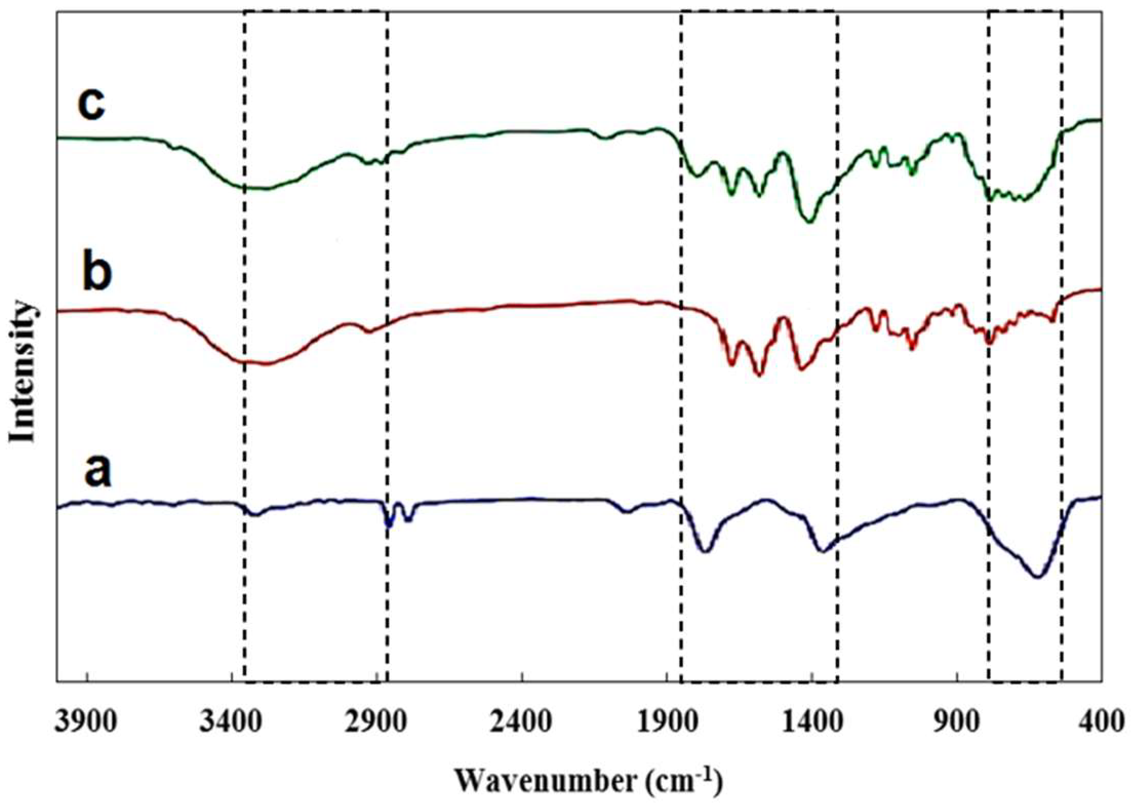 FT-IR spectrum (a) Fe3O4@SiO (b) NiMOF@GO (c) NiMOF@MGO.
