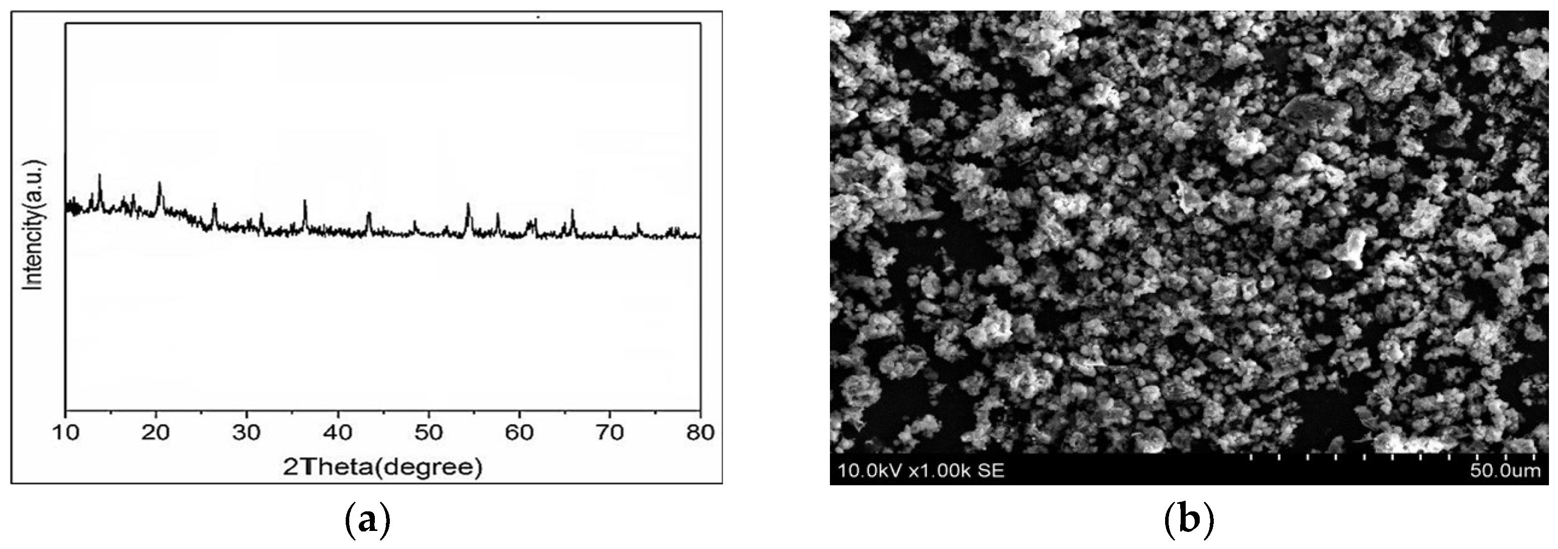 (a) XRD pattern, and (b) SEM image of NiMOF@MGO composite.