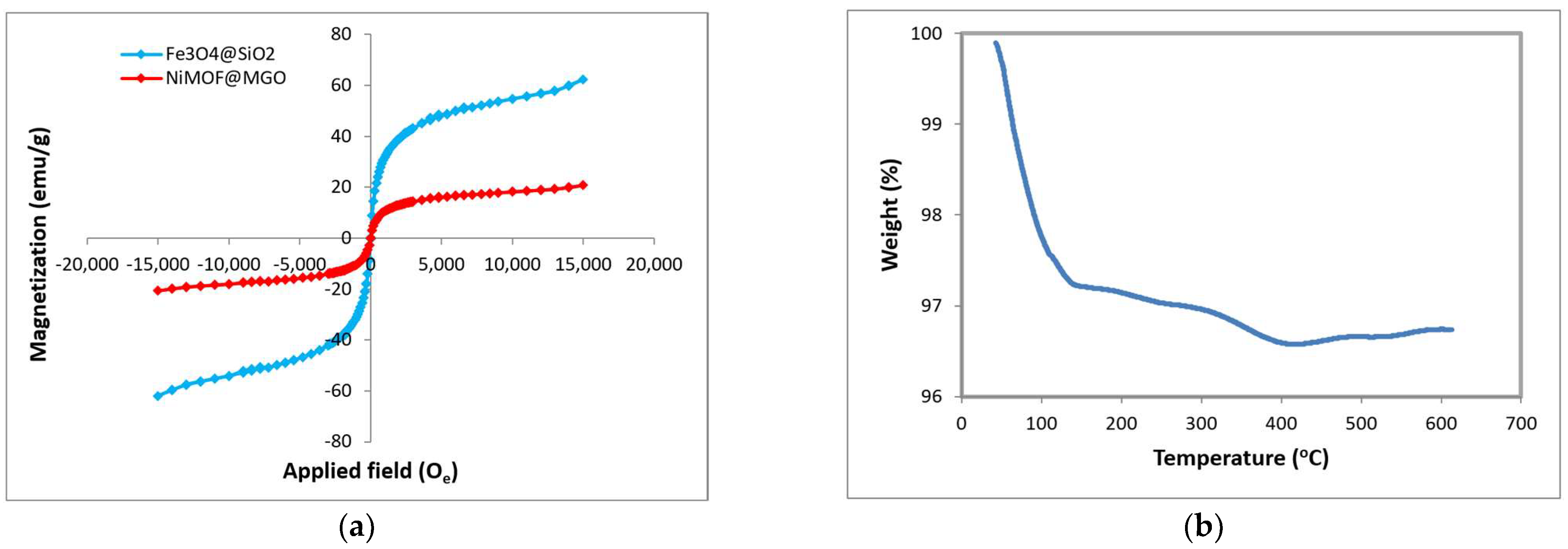 A vibrating sample magnetometer (VSM) was used to assess magnetic characteristics of the nanoparticles at room temperature, and the resulting magnetic hysteresis loops, displayed as s-shaped curves, are shown in Figure 5a. The synthesized Fe3O4@SiO2 nanoparticles exhibit higher magnetic strength compared to the NiMOF@MGO composite nanoparticles. The saturation magnetization (Mₛ) of the composite was determined to be in the range of 3.75 emu/g. Therefore, the synthesized NiMOF@MGO composite has favorable magnetic properties.